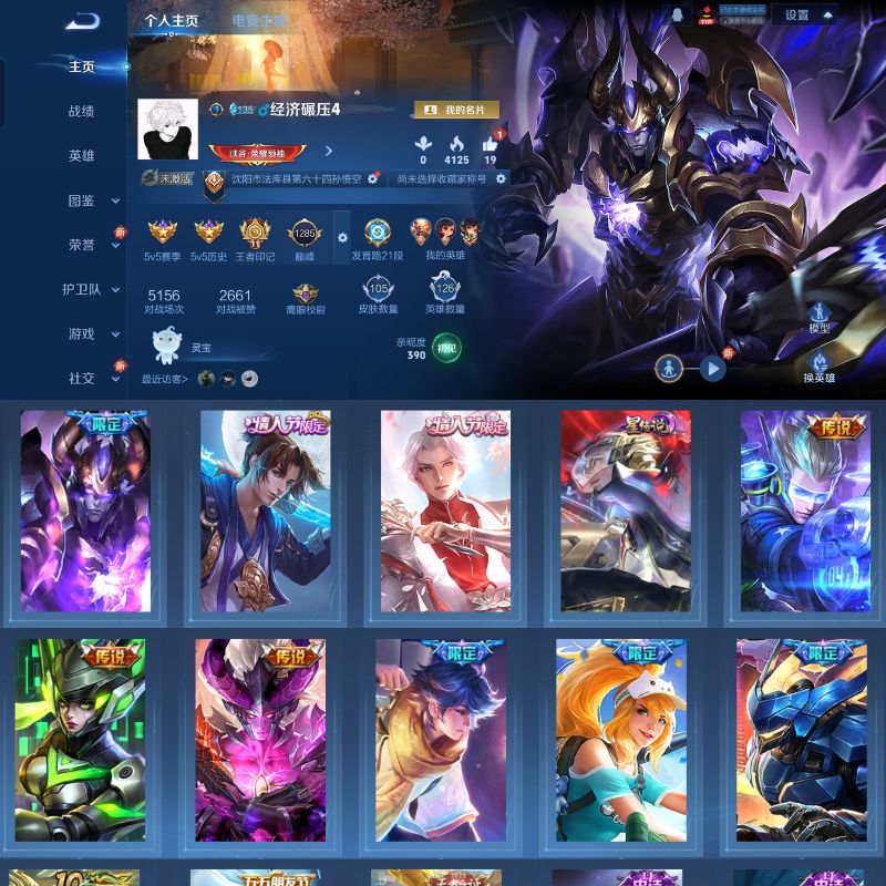 实名: 可修改 贵族等级: V6 英雄数: 126 皮肤数: 170 传说皮: