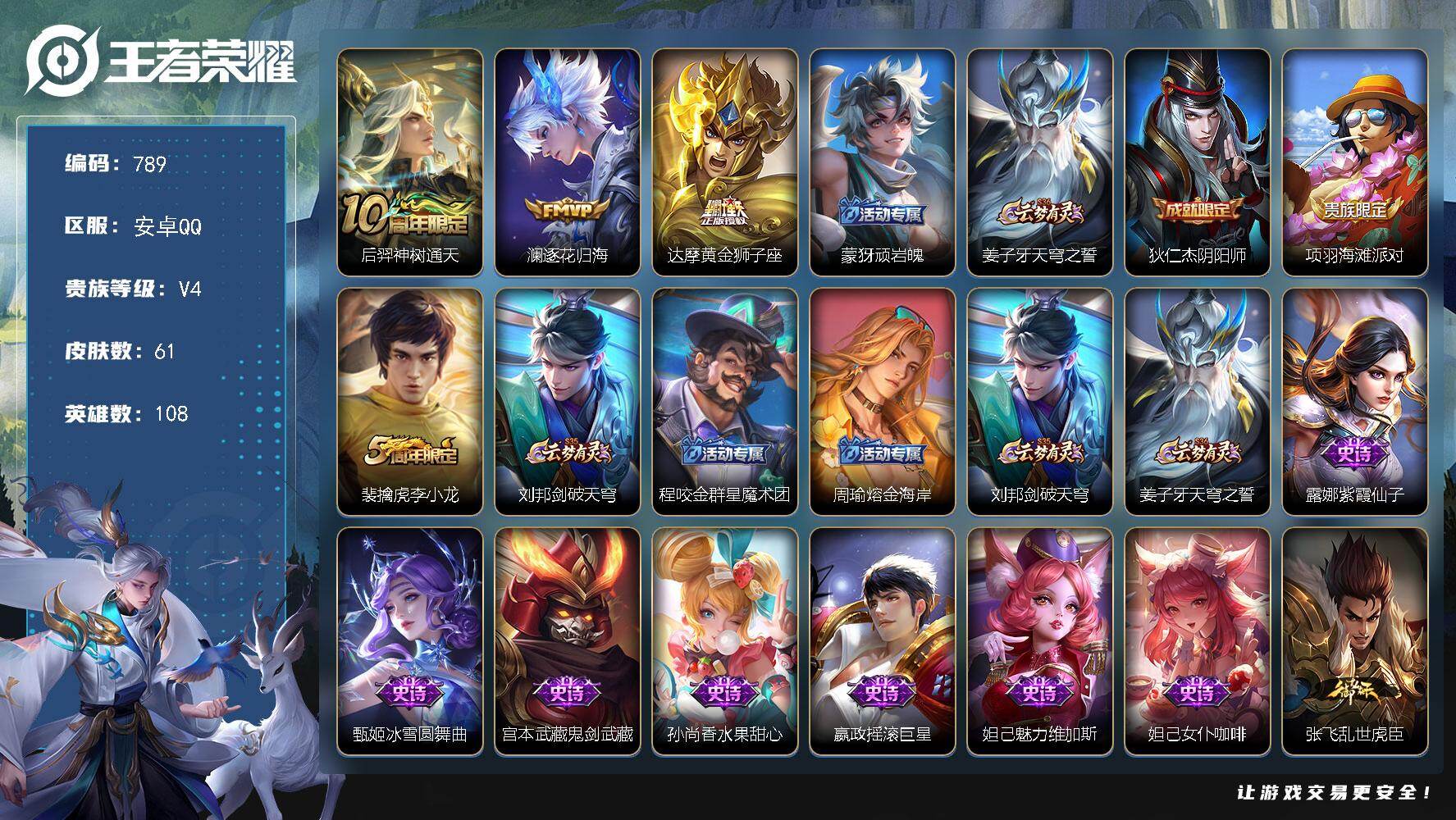 1930160 王者荣耀账号 安卓Q-V4-最强王者段位-108英雄-61皮肤