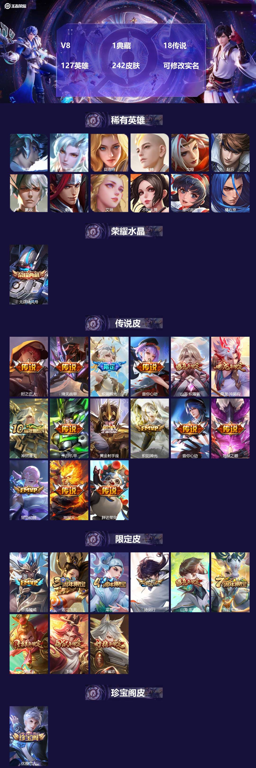 V8 1典藏 18传说 127英雄 242皮肤 可修改实名 【英雄全皮】:敖隐