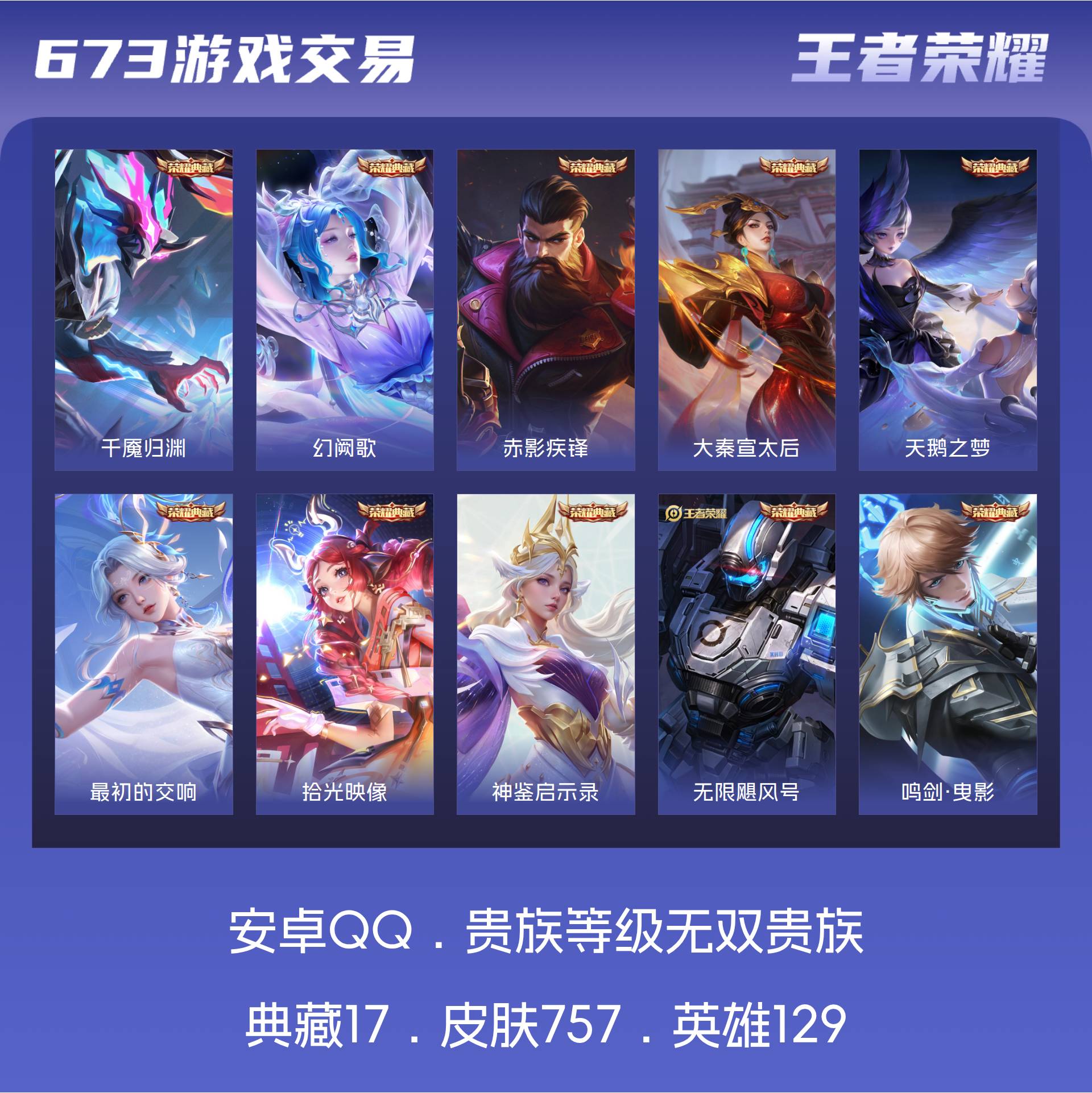 无双贵族 皮肤757 英雄129 最强王者 荣耀典藏17 珍品无双1 无双皮肤13 珍品传说9 传说129 其他皮肤578