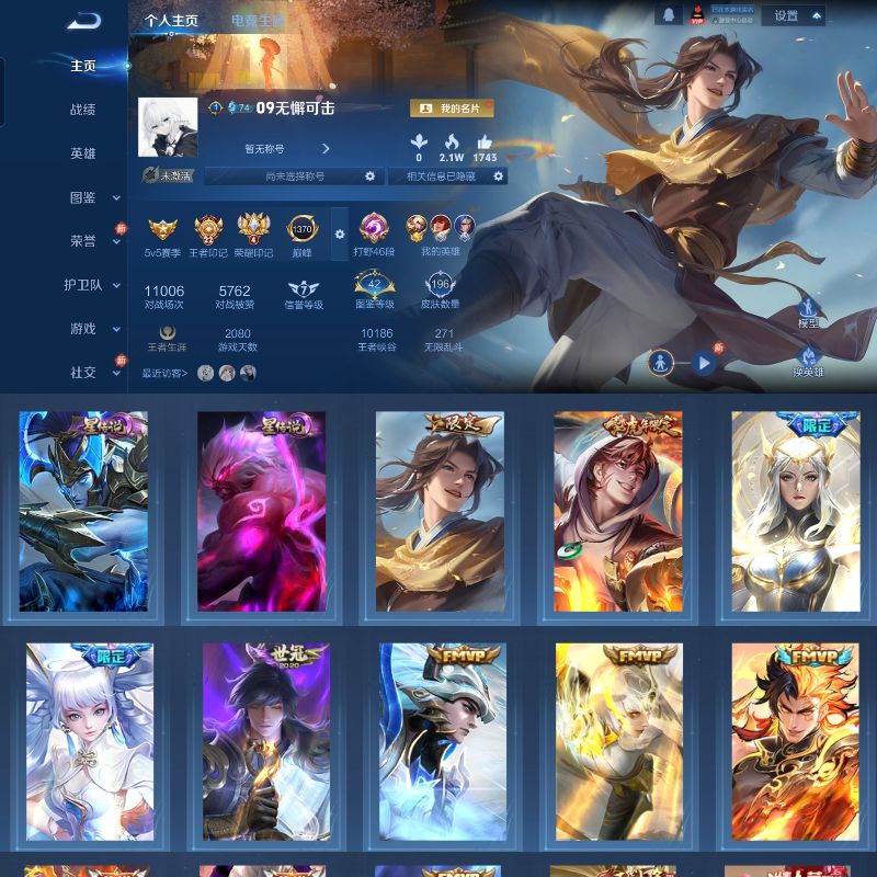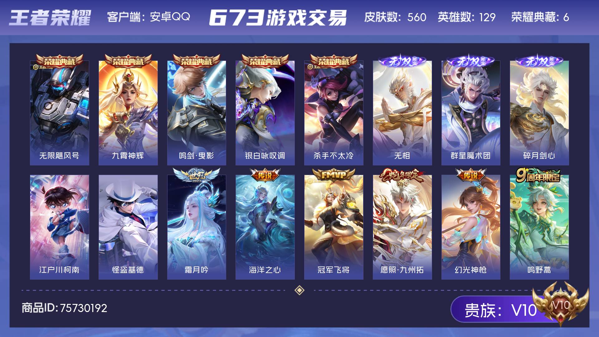 V10 皮肤560 英雄129 至尊星耀 荣耀典藏6 无双皮肤3 珍品传说2 星传说2 传说69 其他皮肤485