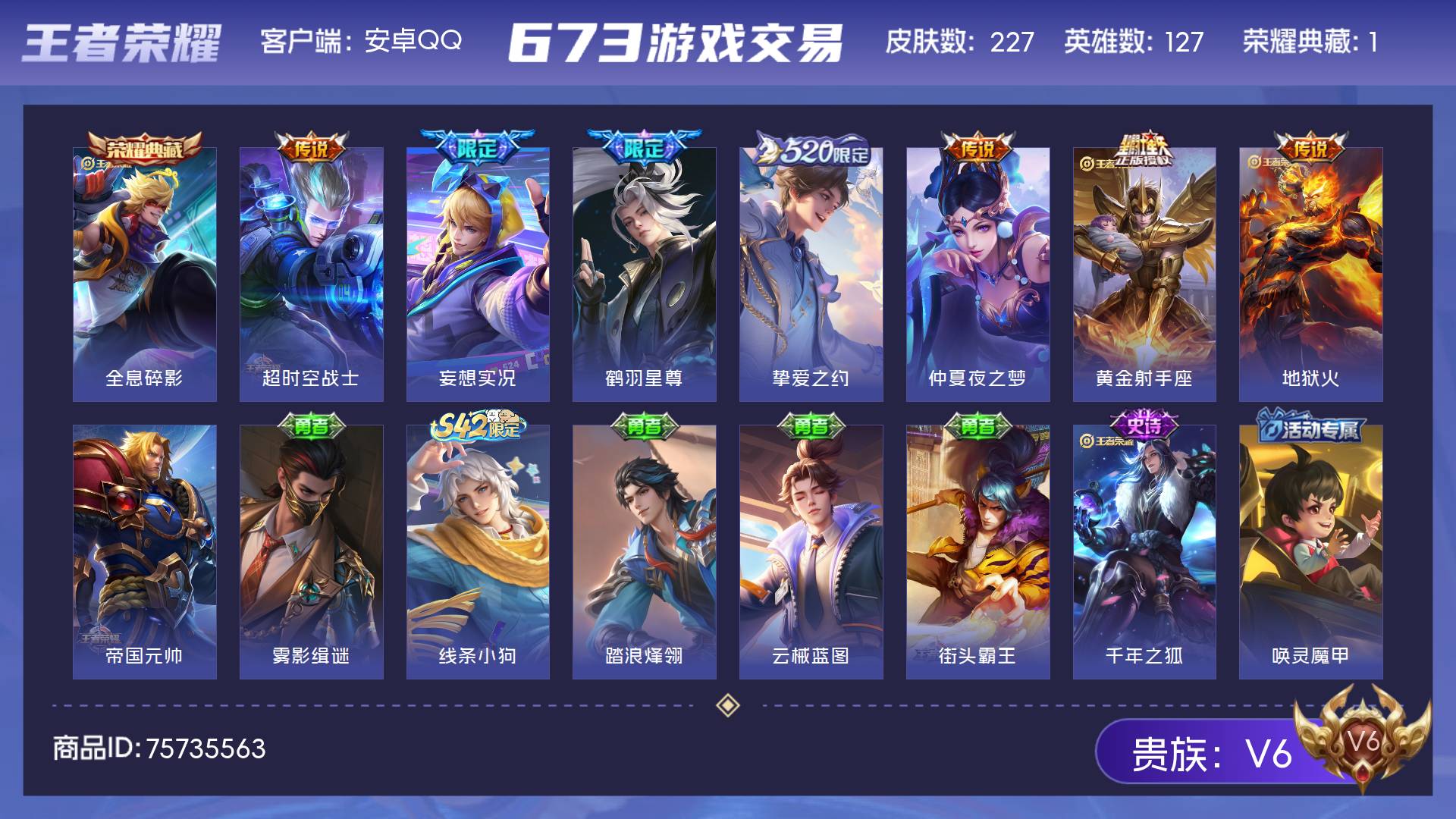 V6 皮肤227 英雄127 永恒钻石 荣耀典藏1 传说7 其他皮肤223