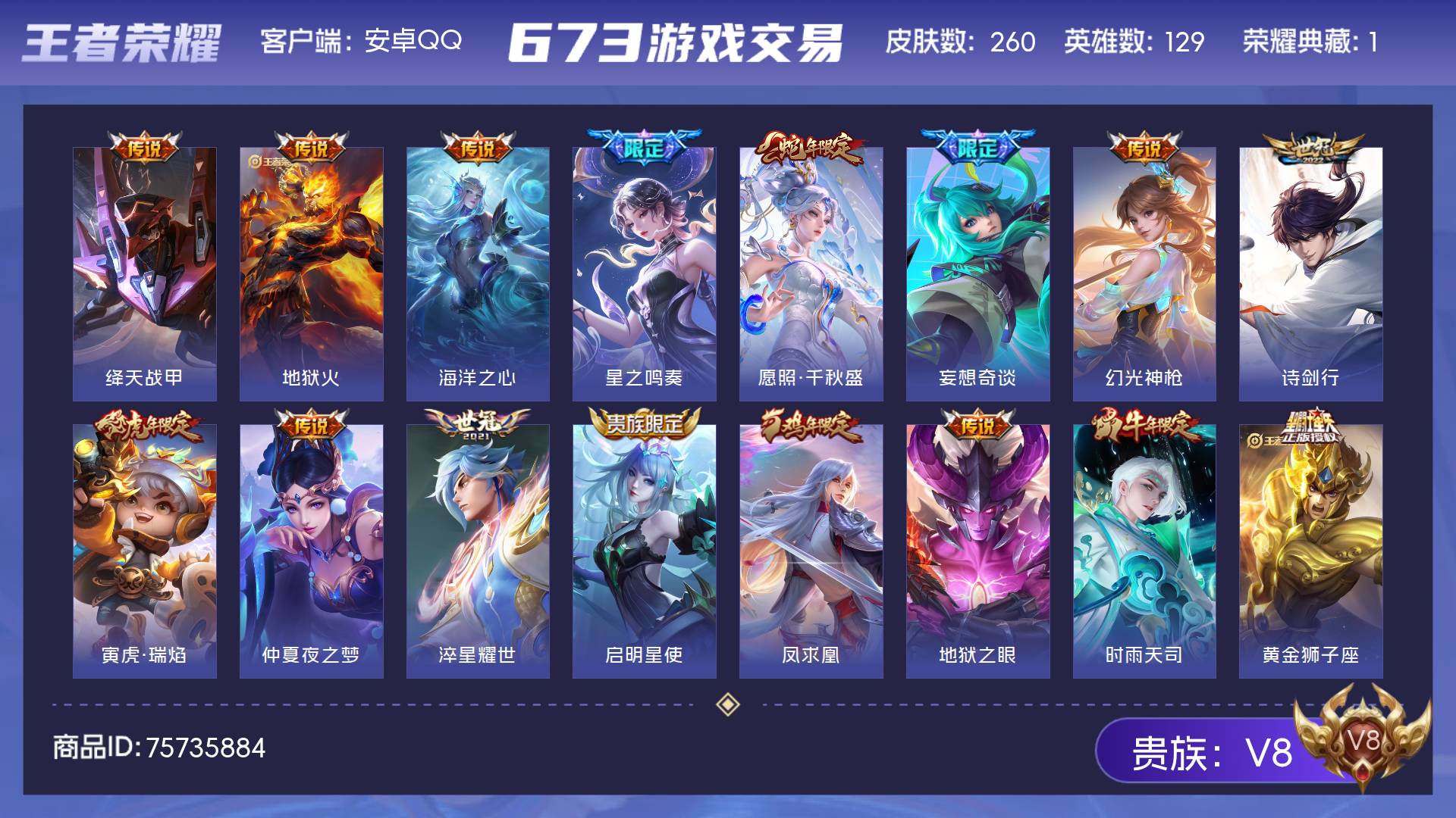 V8 皮肤260 英雄129 永恒钻石 荣耀典藏1 星传说1 传说22 其他皮肤244
