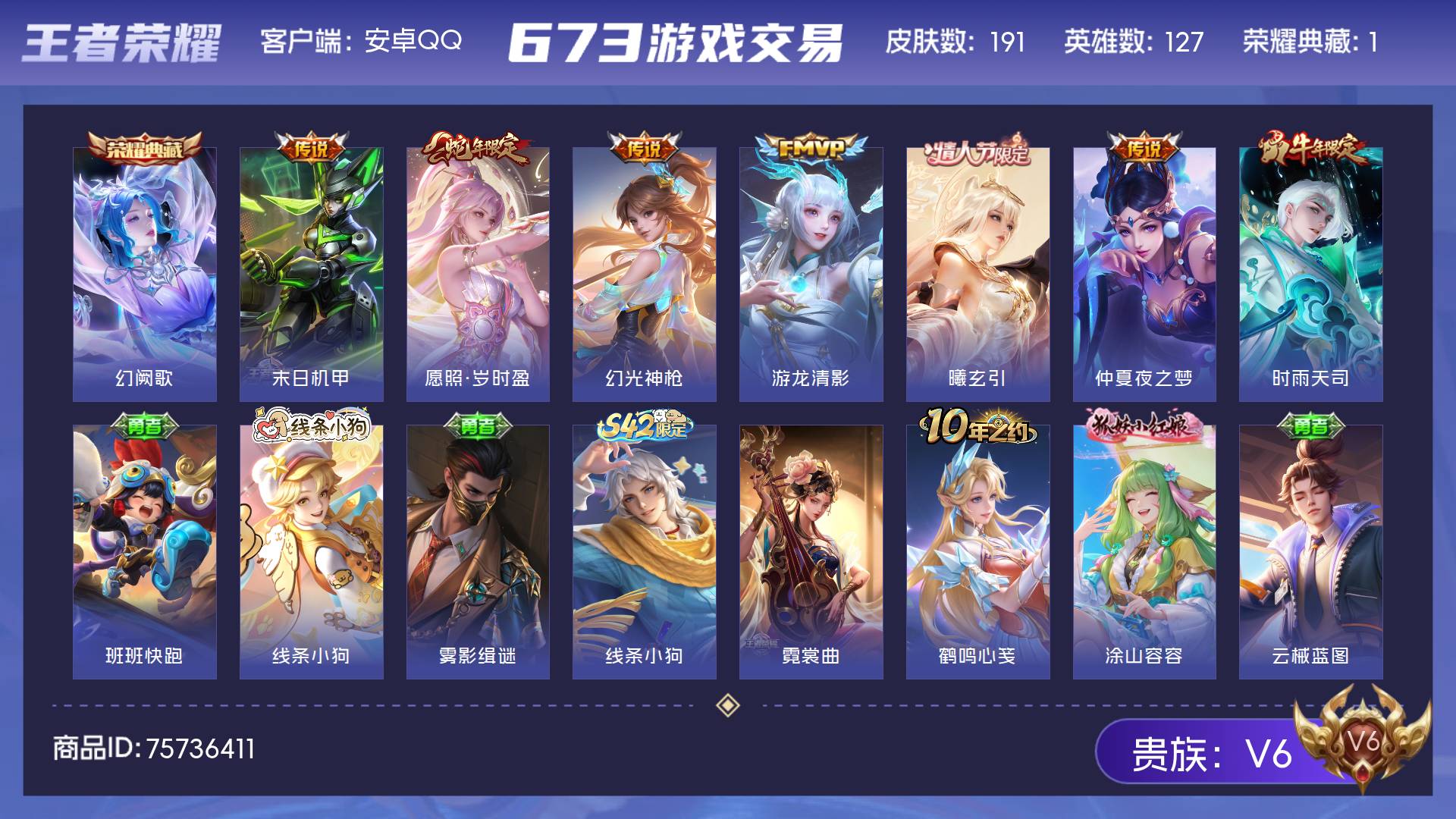 V6 皮肤191 英雄127 至尊星耀 荣耀典藏1 传说7 其他皮肤189