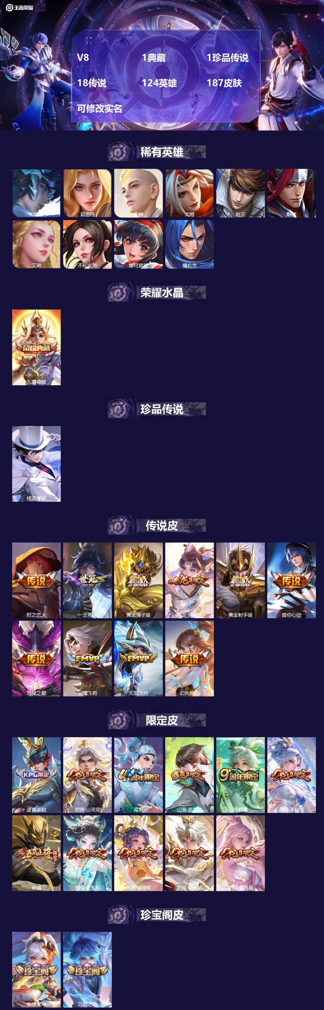 V8 1典藏 1珍品传说 18传说 124英雄 187皮肤 可修改实名