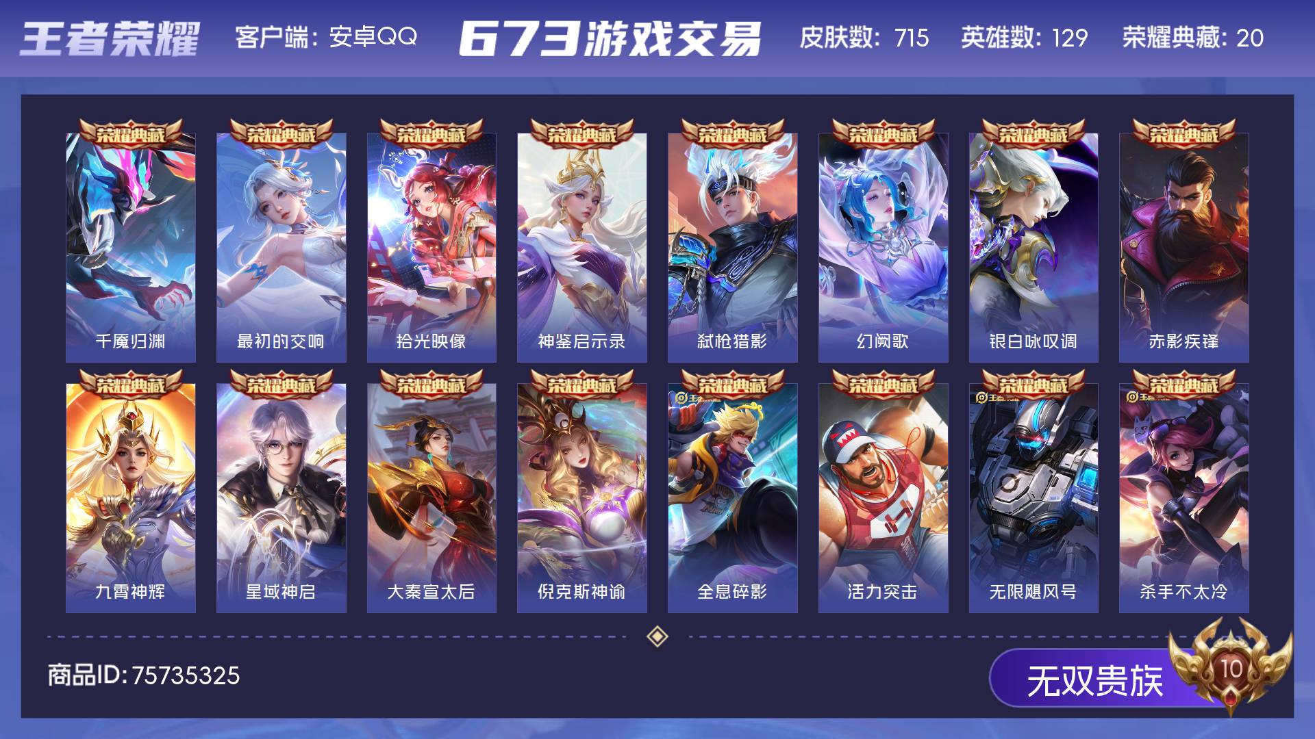 无双贵族 皮肤715 英雄129 荣耀王者 荣耀典藏20 无双皮肤10 珍品传说7 星传说22 传说118 其他皮肤556