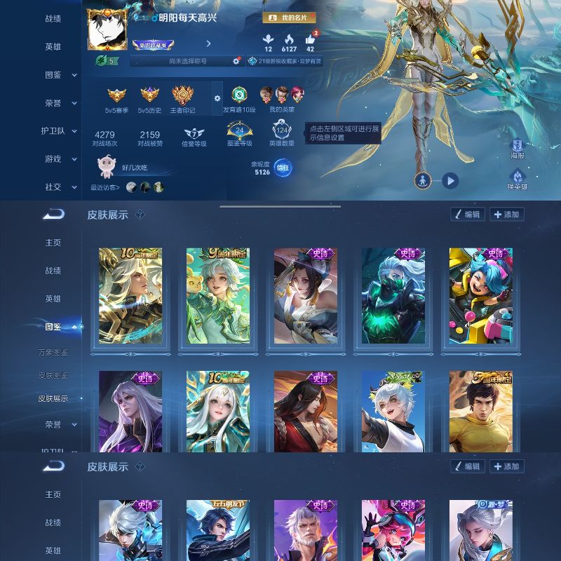 贵族10 荣耀典藏4 无双2 珍品传说2 星元皮肤5 传说皮肤49 星元套装40皮肤数量五百