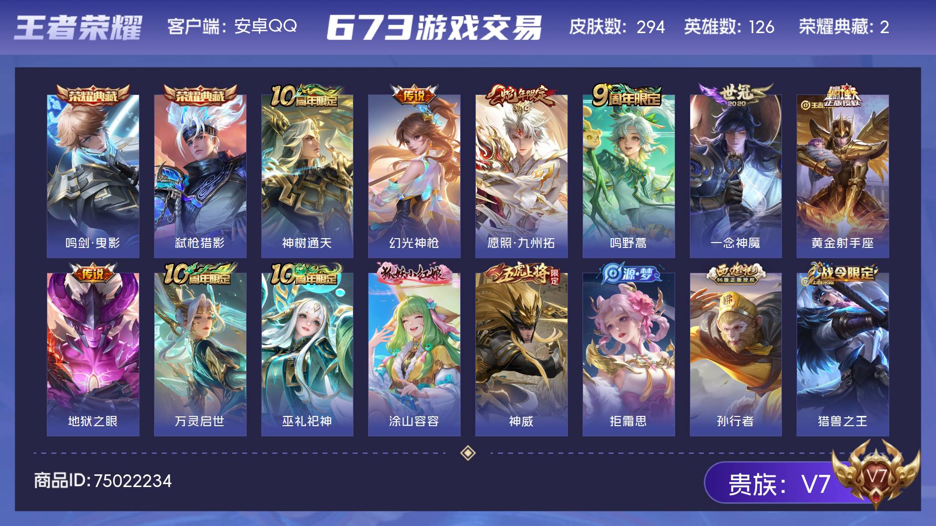 安卓QQ/至尊星耀/174皮肤/127英雄/1典藏/0珍品无双/2无双/0珍品传说/7传说/48史诗