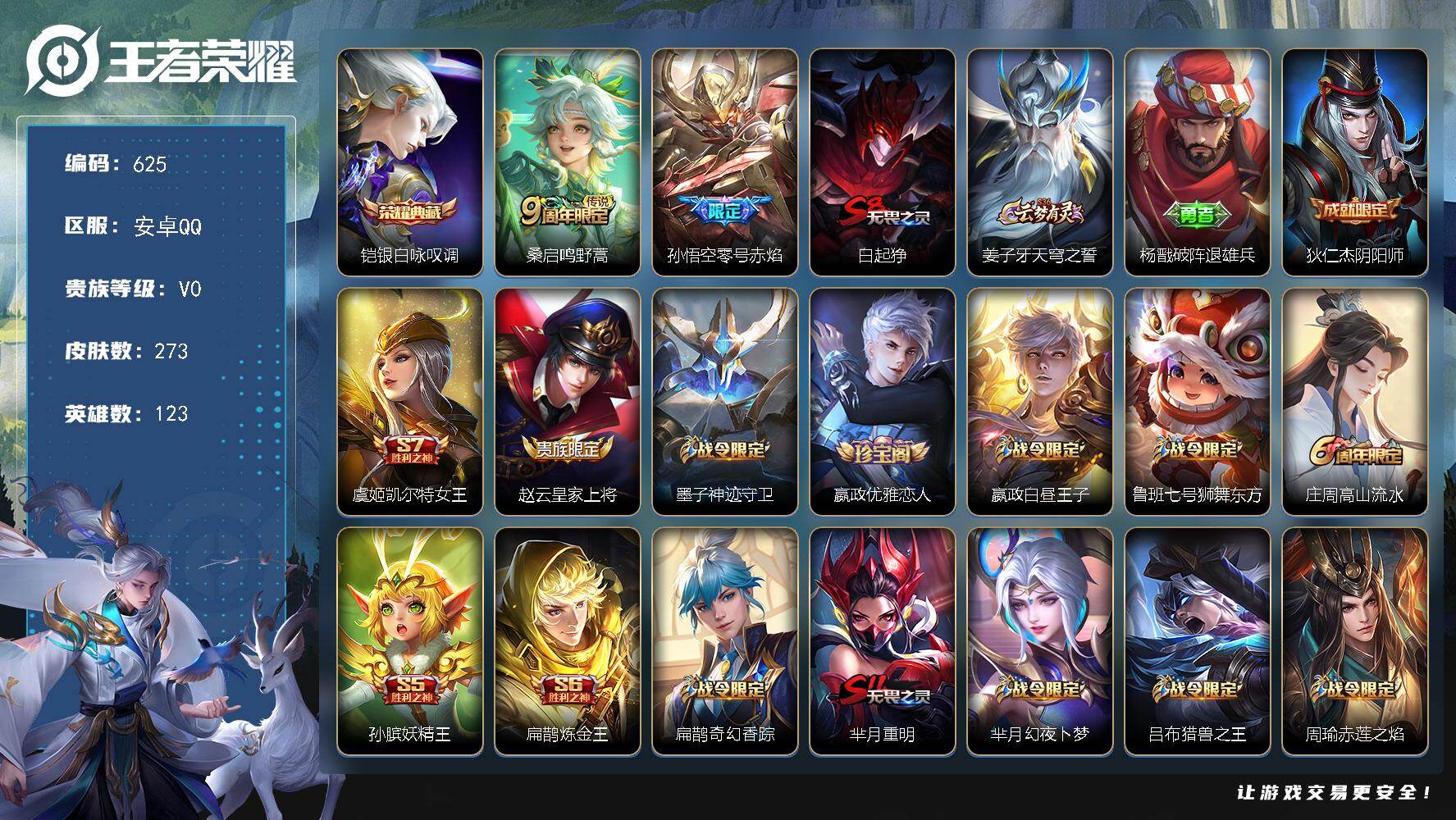 安卓Q-V0-尊贵铂金IV段位-123英雄-273皮肤-1典藏皮肤-2传说-7