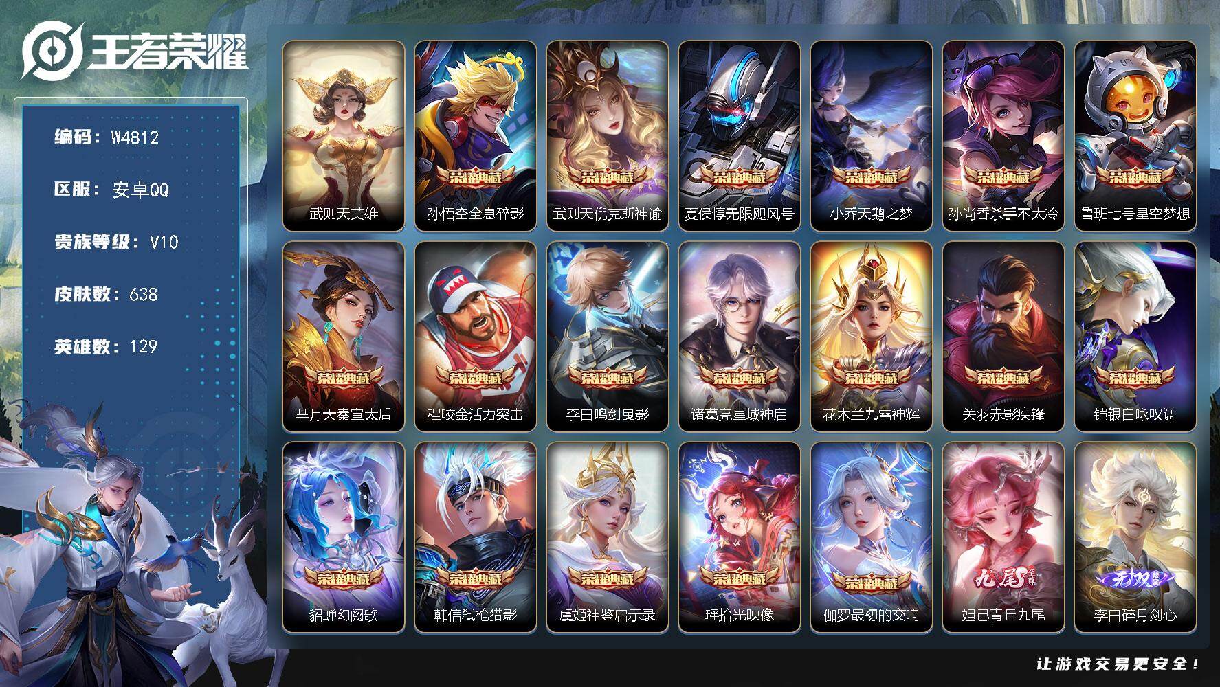 【W4812】安卓Q区-无二次-贵10-129英雄-638皮肤-21典藏(1水