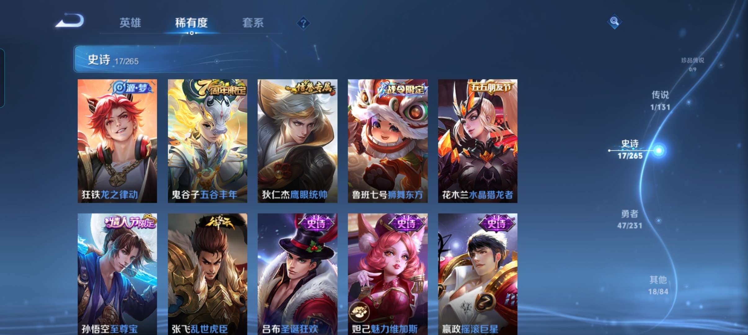 安卓Q-V8-至尊星耀I段位-126英雄-179皮肤-1典藏皮肤-3无双-4珍