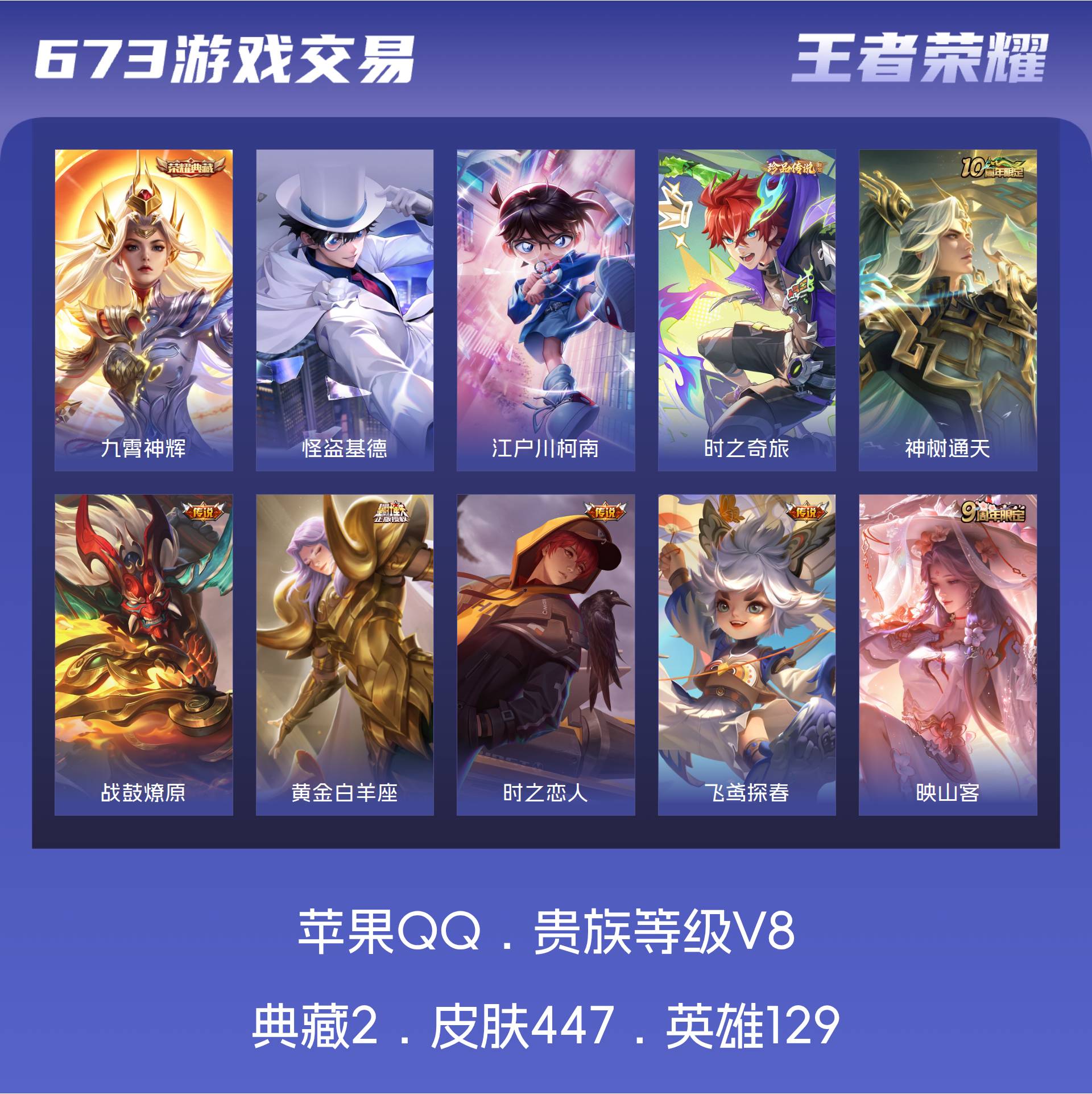V8 皮肤447 英雄129 永恒钻石 荣耀典藏2 珍品传说3 星传说2 传说24 其他皮肤424