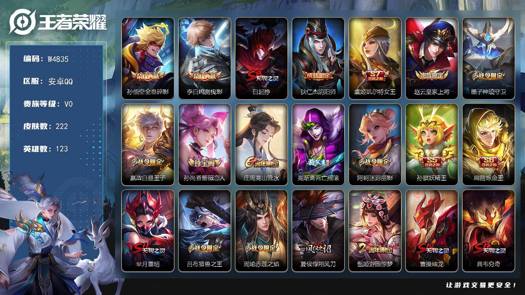 【W4839】安卓Q区-可二次-贵7-125英雄-207皮肤-1典藏-12传说