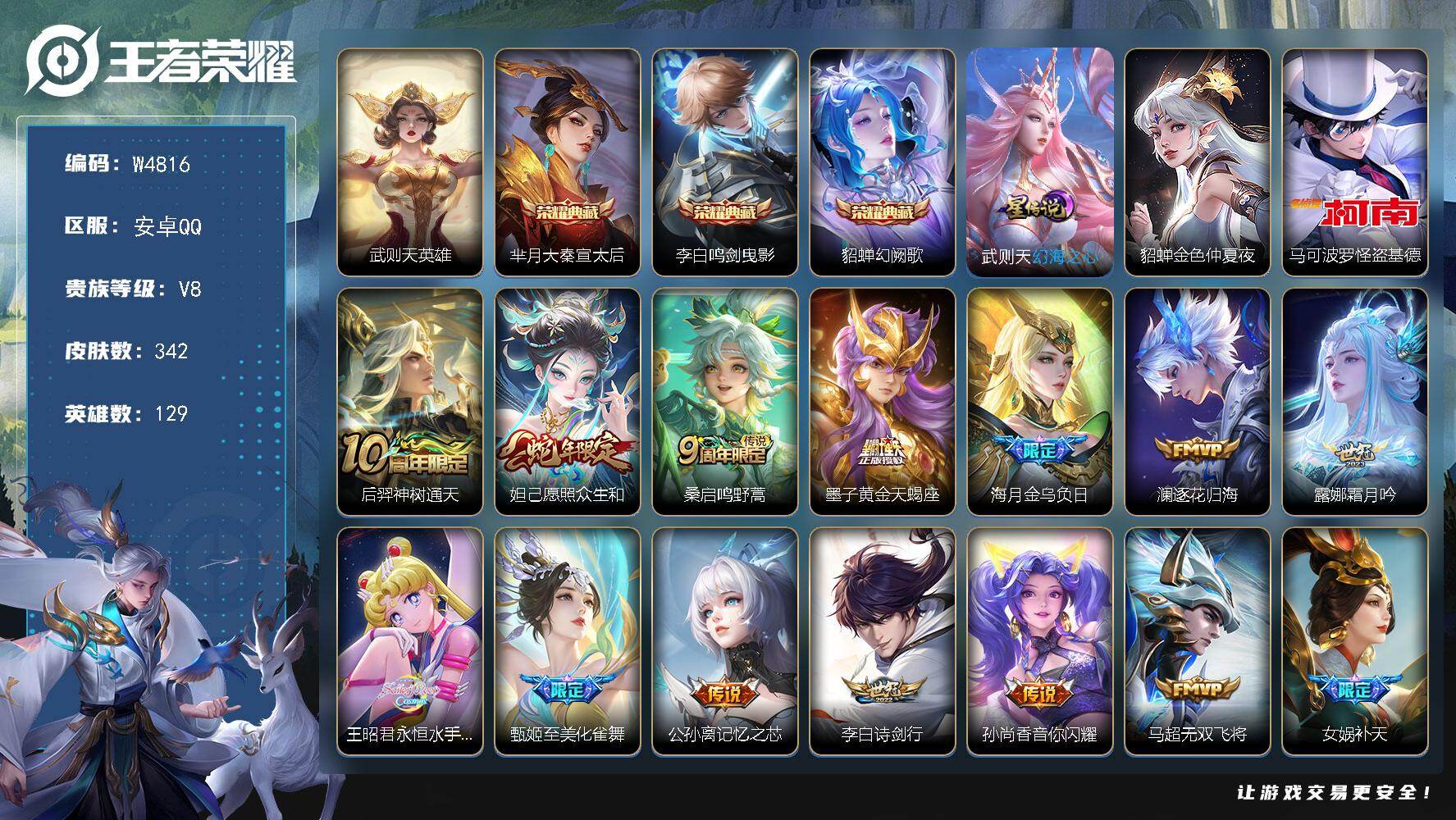 V8 1典藏 9传说 125英雄 245皮肤 可修改实名 【英雄全皮】影全皮