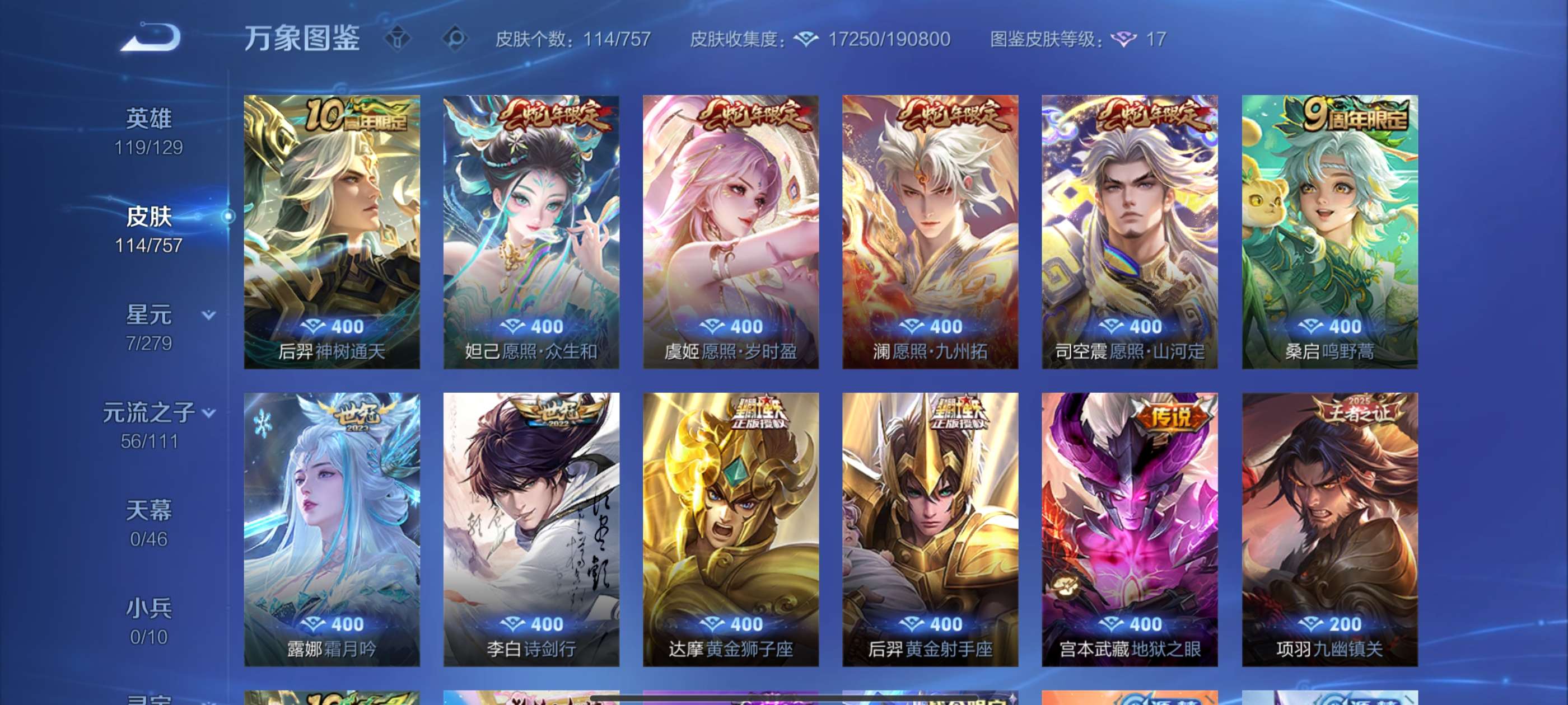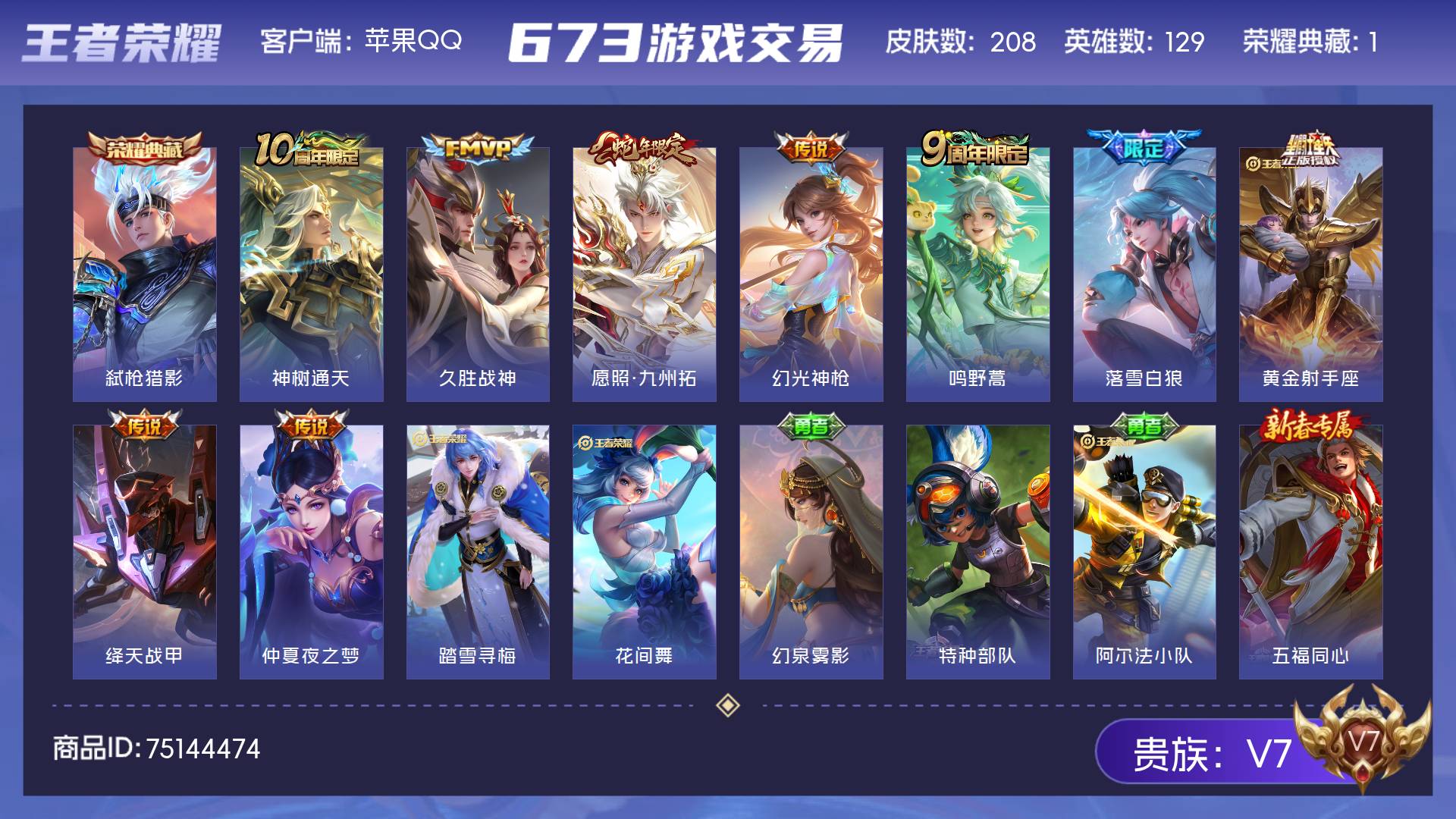 V7 皮肤208 英雄129 最强王者 荣耀典藏1 星传说1 传说9 其他皮肤204
