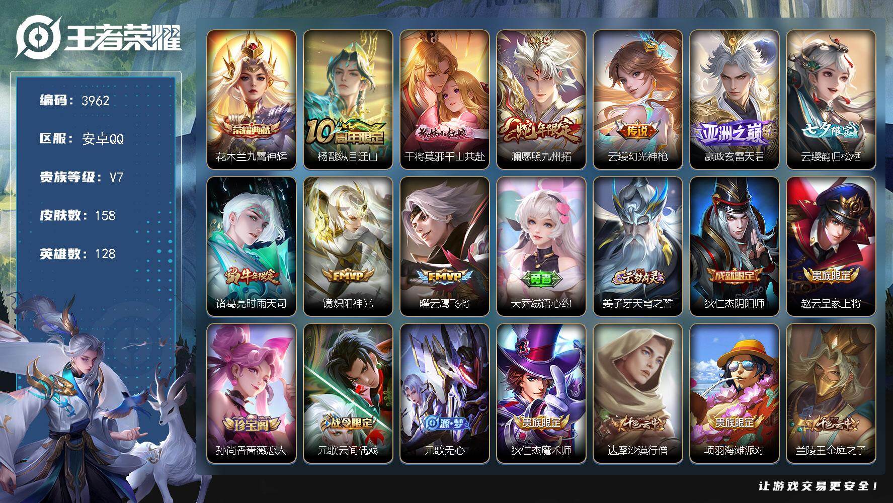 安卓Q-V7-永恒钻石V段位-128英雄-158皮肤-1典藏皮肤-9传说-41