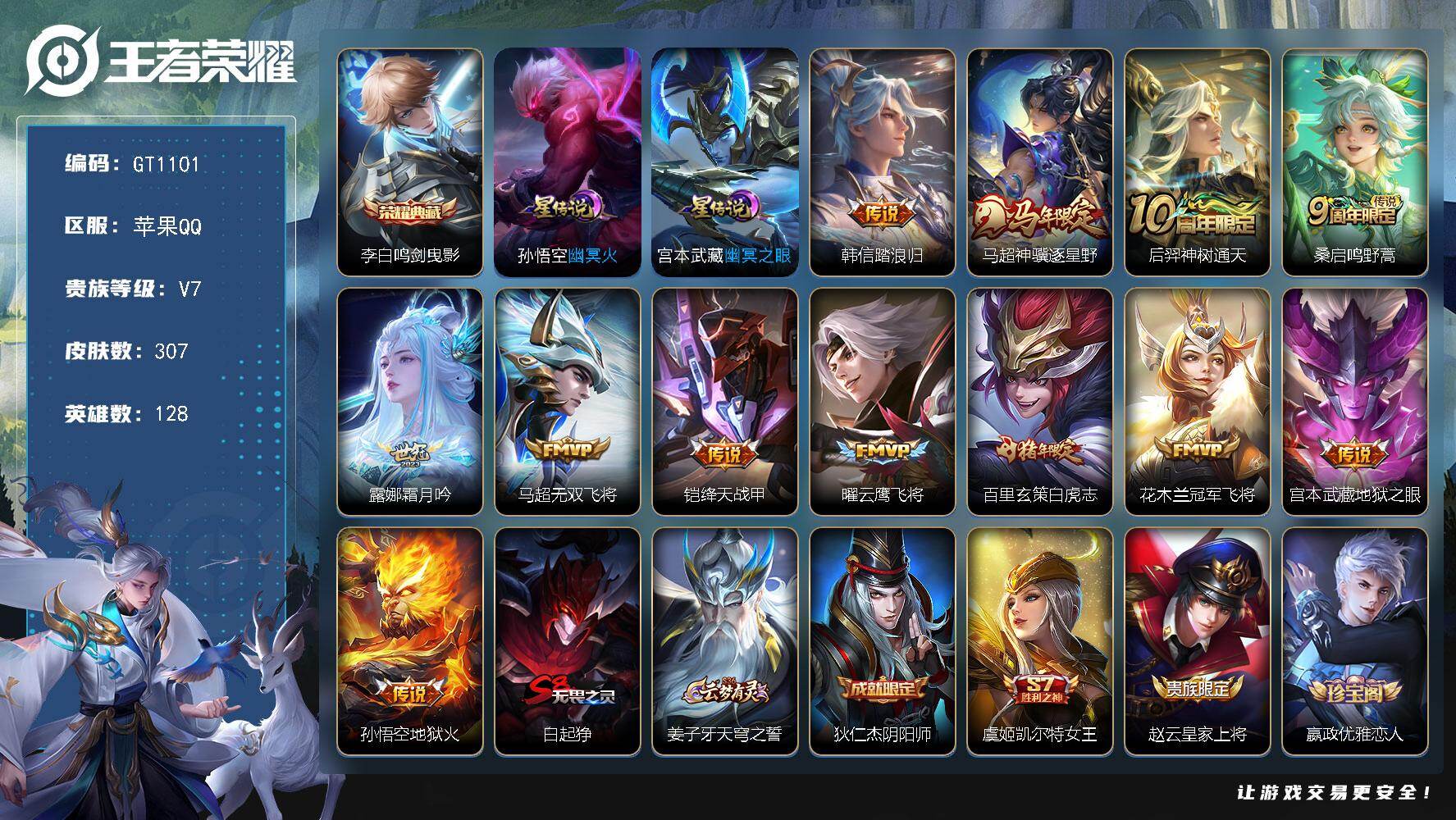 V7 皮肤159 英雄129 至尊星耀 荣耀典藏1 无双皮肤1 珍品传说1 星传说1 传说15