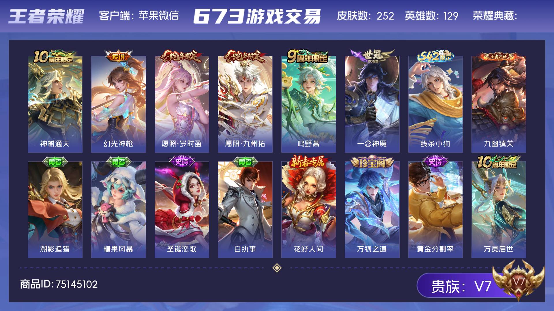 V7 皮肤252 英雄129 至尊星耀 传说6 其他皮肤251
