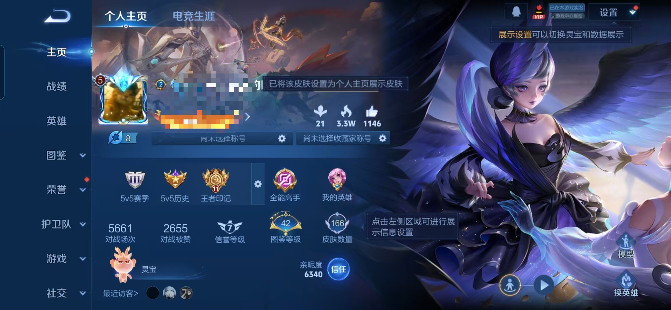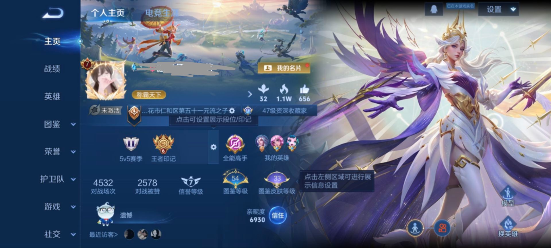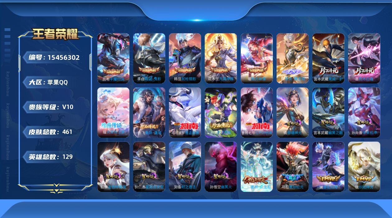 实名: 可修改 贵族等级: V5 英雄数: 112 皮肤数: 62 传说皮: