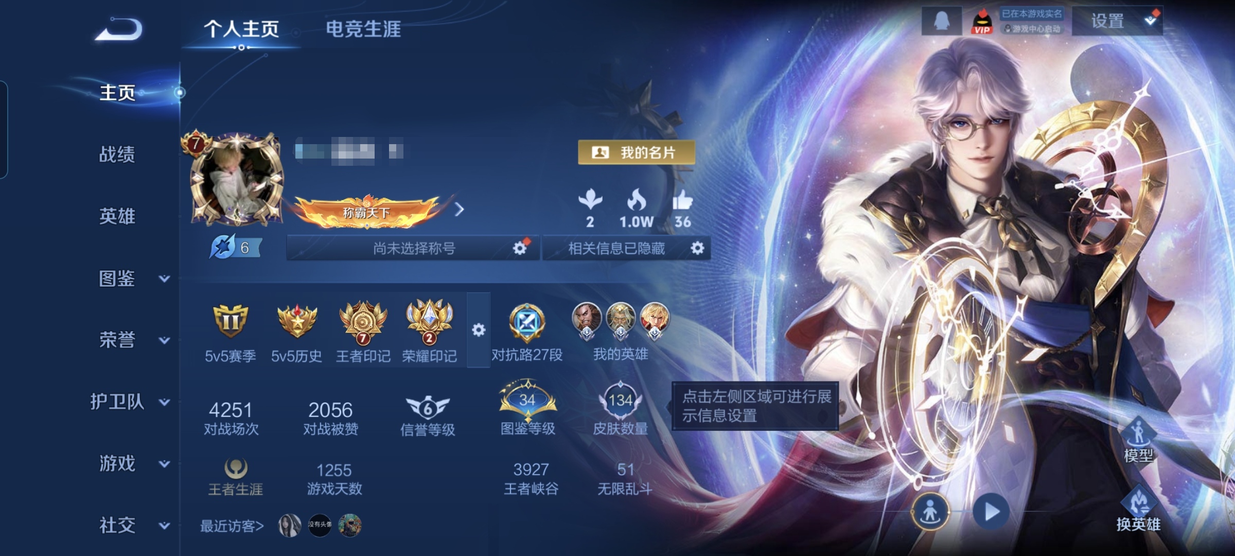 实名: 可修改 贵族等级: V4 英雄数: 82 皮肤数: 51 传说皮: 乘