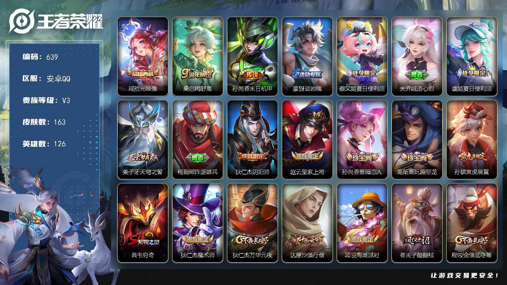 安卓Q-V3-最强王者段位-126英雄-163皮肤-1典藏皮肤-2传说-44史