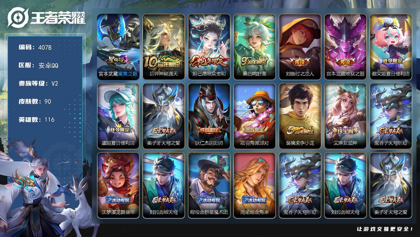 安卓Q-V2-最强王者段位-116英雄-90皮肤-5传说-18史诗【传说皮肤