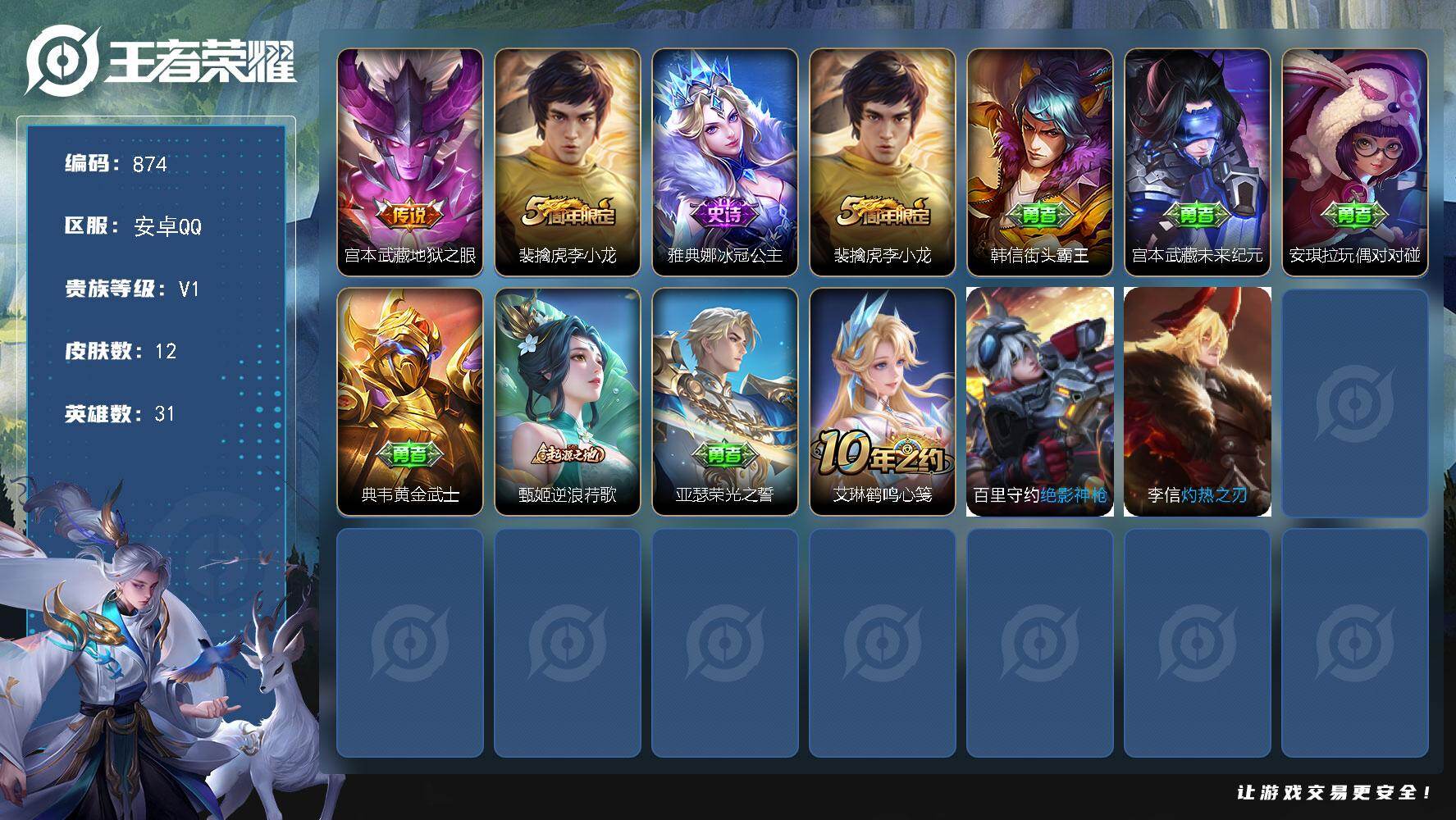 1992713 王者荣耀账号 安卓Q-V1-永恒钻石V段位-31英雄-12皮肤