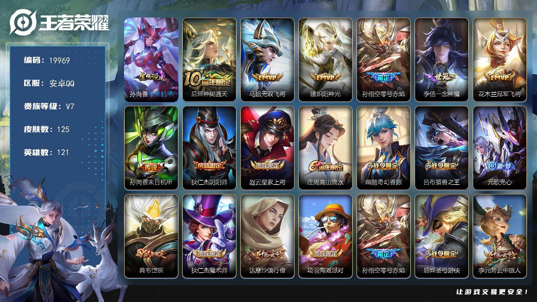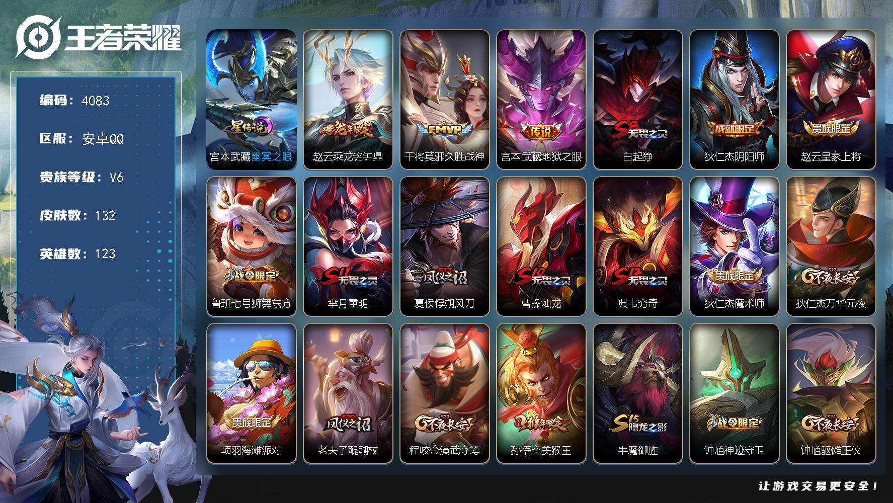 安卓Q-V6-永恒钻石III段位-123英雄-132皮肤-3传说-18史诗【
