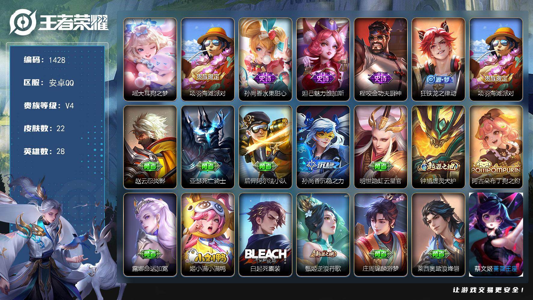 【商品标题】:安卓Q-V7-永恒钻石III段位-121英雄-157皮肤-0典藏