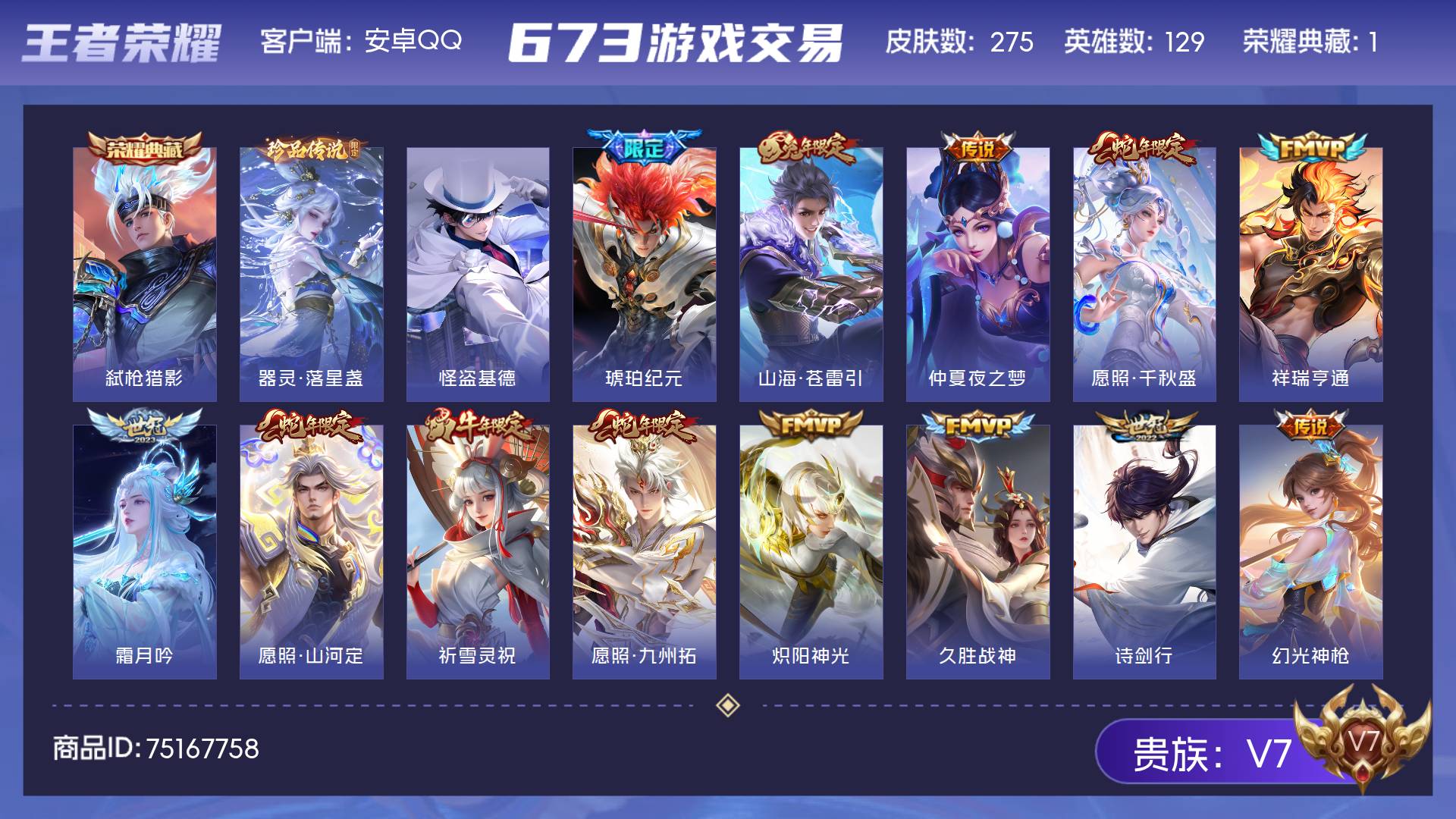 V7 皮肤275 英雄129 永恒钻石 荣耀典藏1 珍品传说2 星传说1 传说14 其他皮肤264
