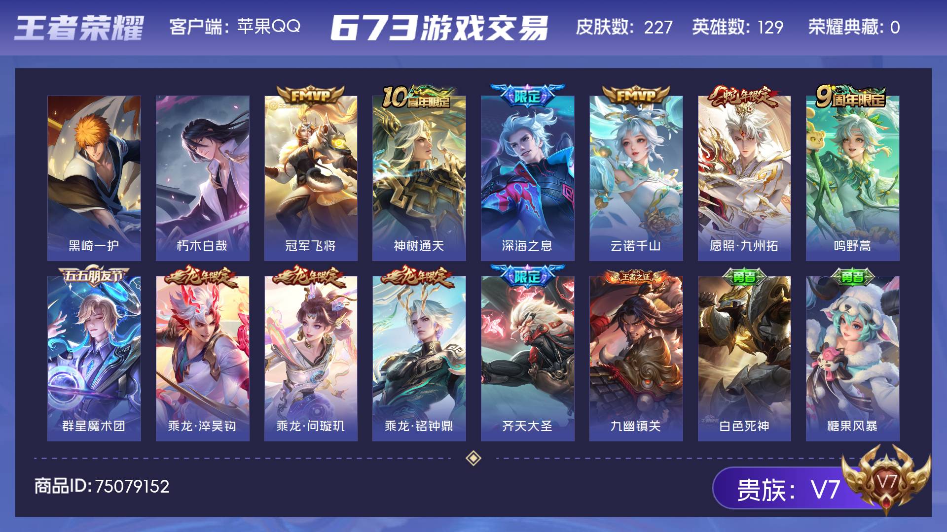 V7 皮肤227 英雄129 永恒钻石 珍品传说2 星传说1 传说11 其他皮肤220