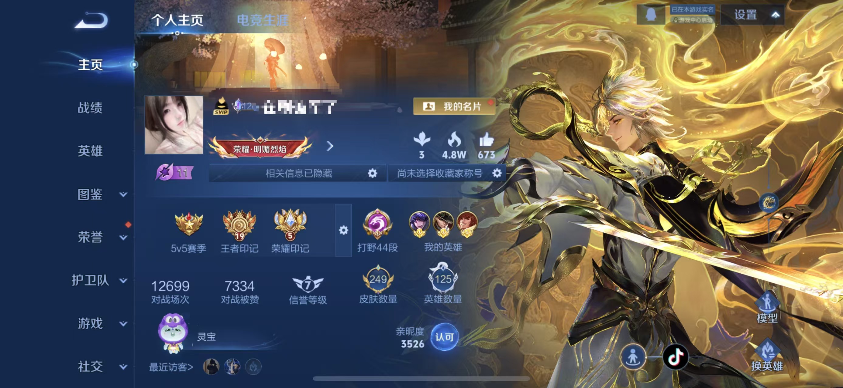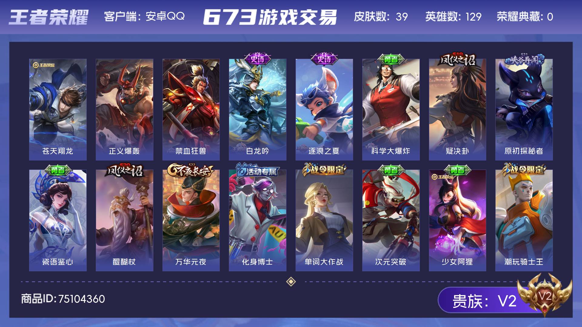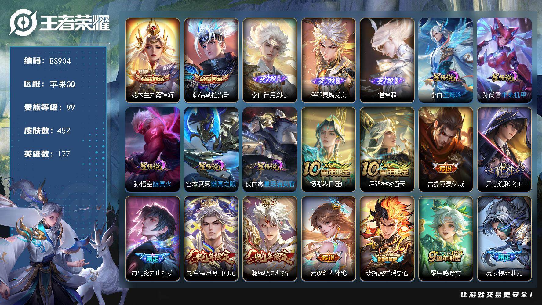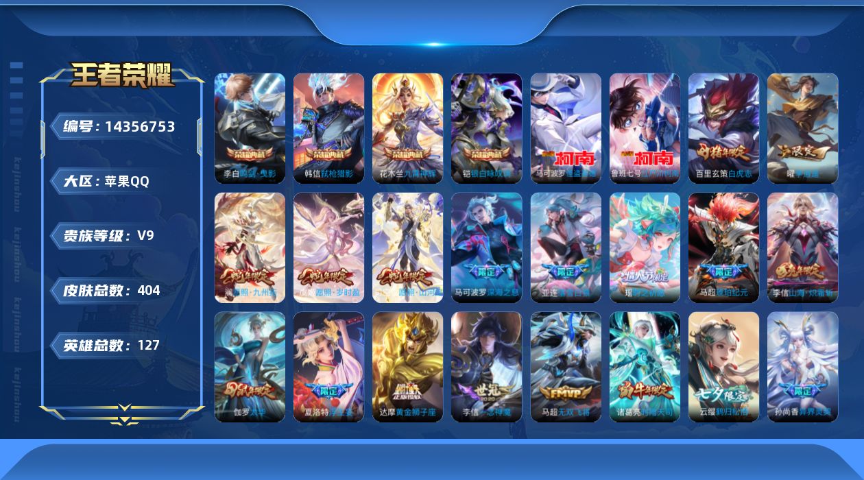 实名: 可修改 性别: 男号 贵族等级: V9 英雄数: 127 皮肤数: 40