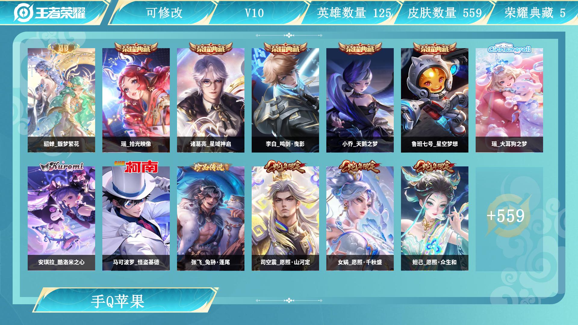 V9 1典藏 1无双 2珍品传说 34传说 127英雄 426皮肤 可修改实名