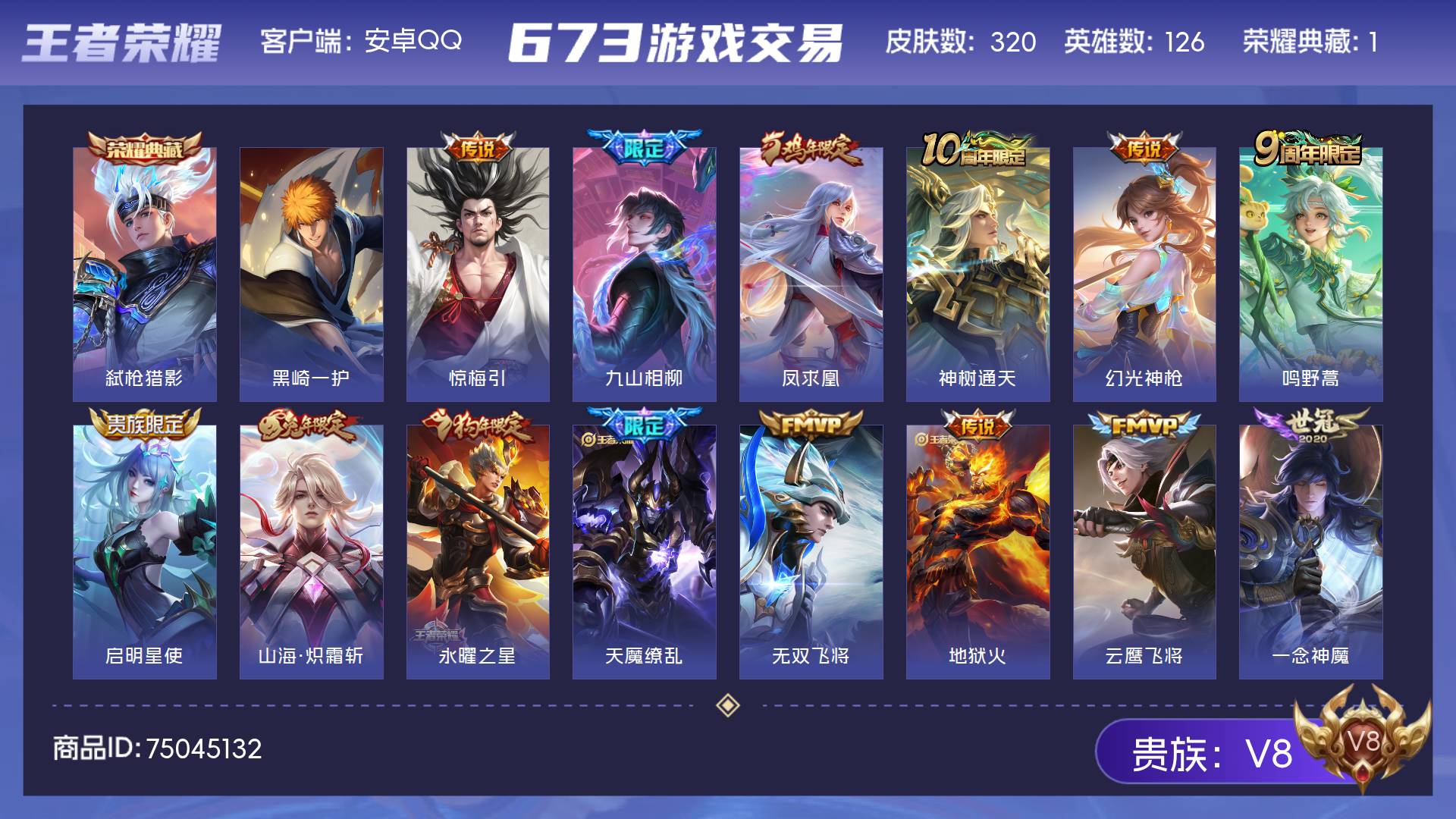 贵族等级: V8 英雄数: 126 皮肤数: 271 荣耀水晶: 银白咏叹调,
