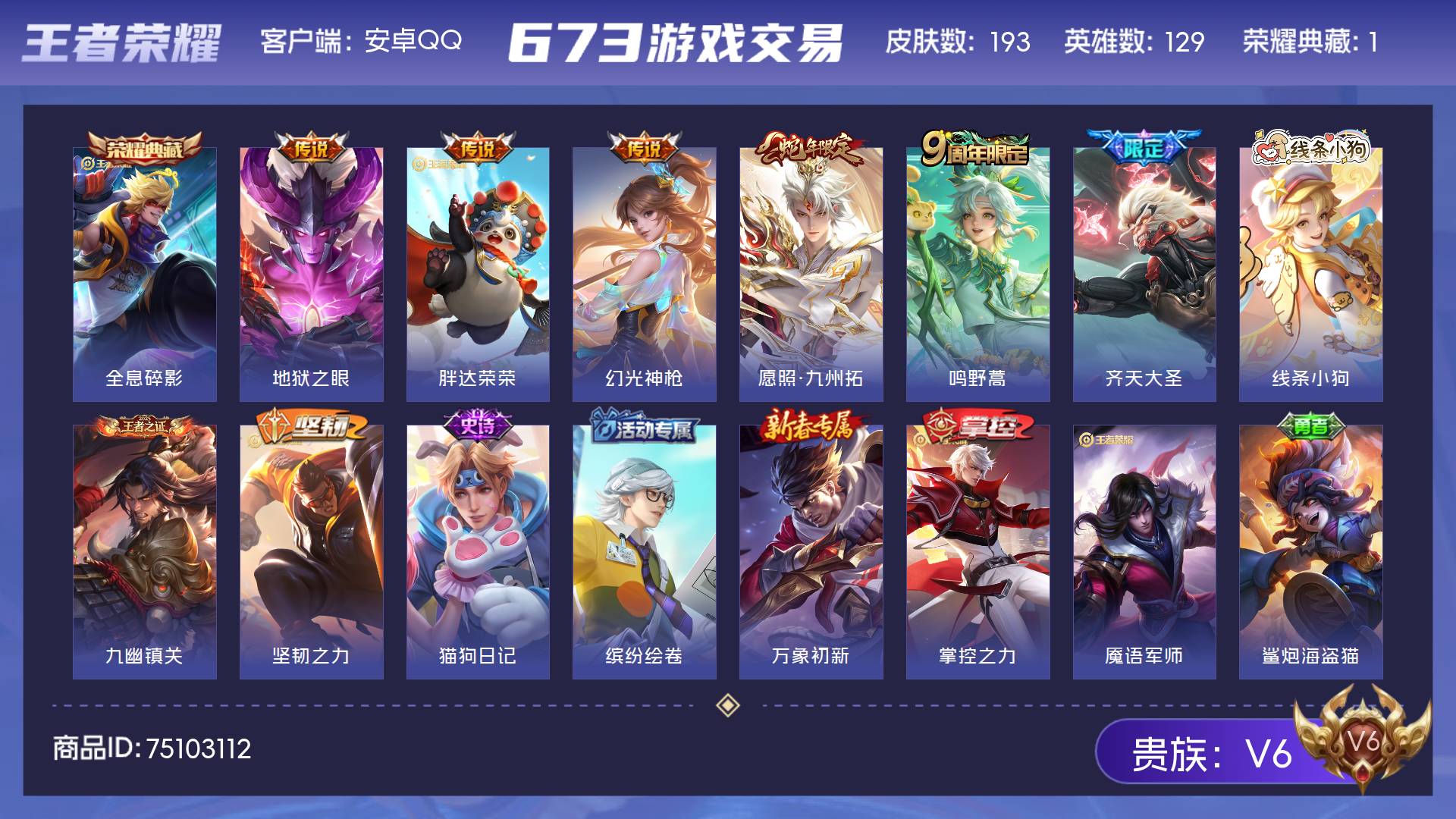 V6 皮肤193 英雄129 至尊星耀 荣耀典藏1 传说6 其他皮肤193