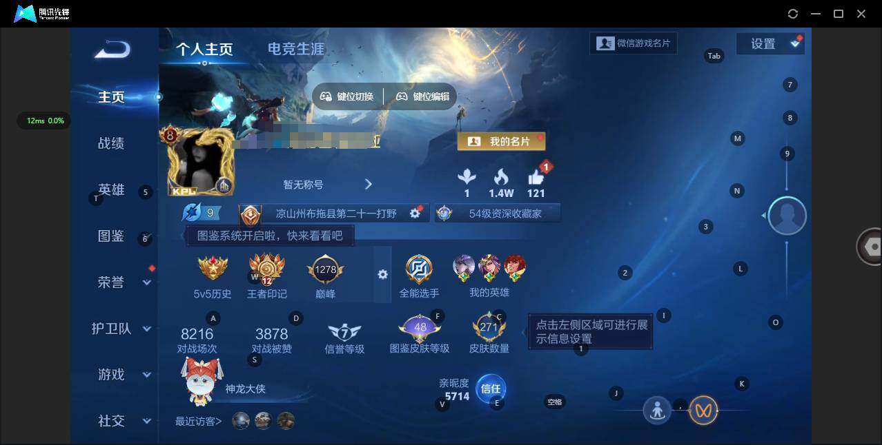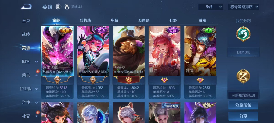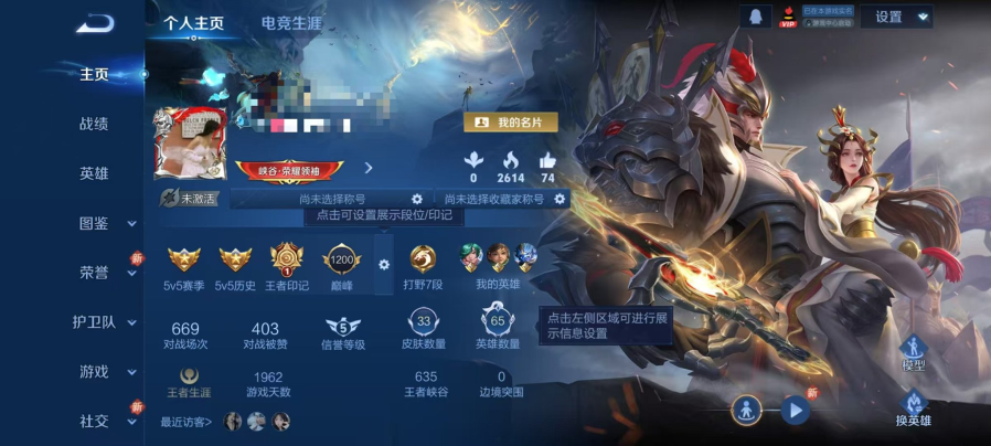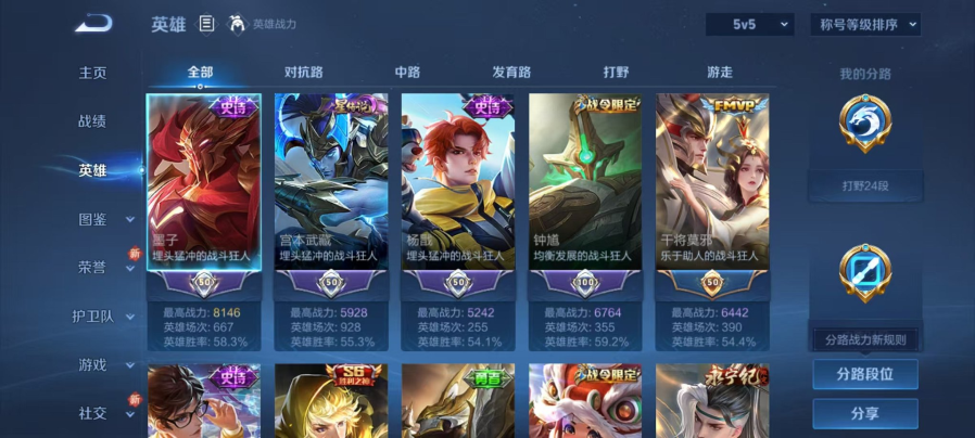 贵族等级: V6 英雄数: 105 皮肤数: 118 荣耀水晶: 鸣剑·曳影