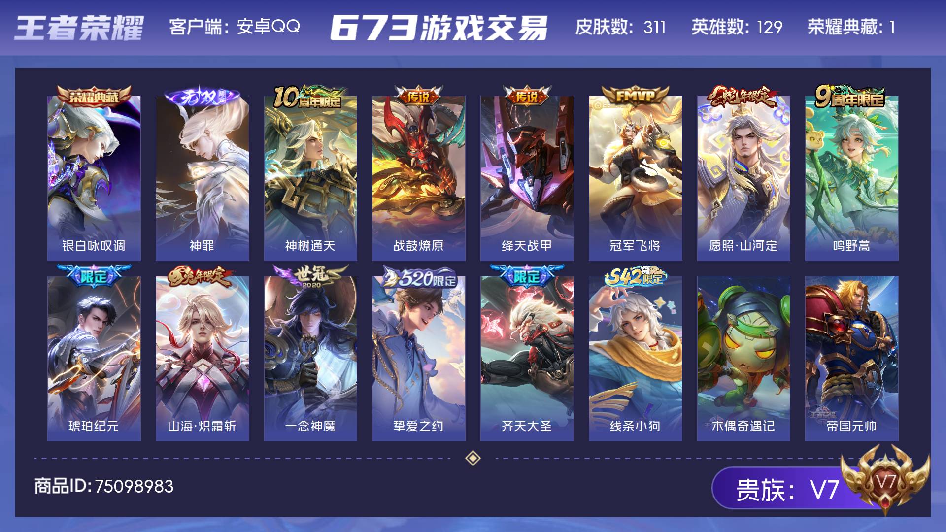 V7 皮肤311 英雄129 至尊星耀 荣耀典藏1 无双皮肤1 传说11 其他皮肤304