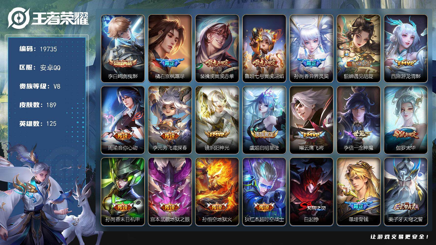 安卓QQ/荣耀王者/261皮肤/126英雄/2典藏/0珍品无双/0无双/3珍品传说/8传说/72史诗