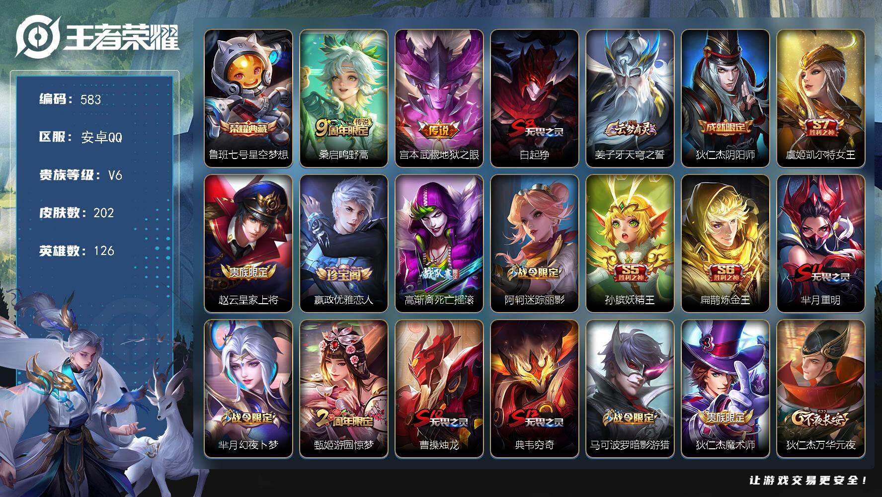 安卓Q-V6-至尊星耀I段位-126英雄-202皮肤-1典藏皮肤-2传说-58