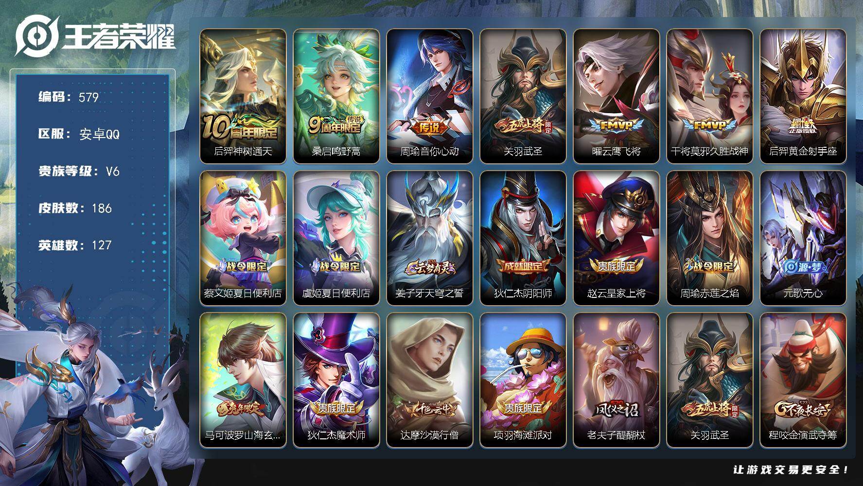实名: 可修改 贵族等级: V5 英雄数: 125 皮肤数: 147 传说皮: