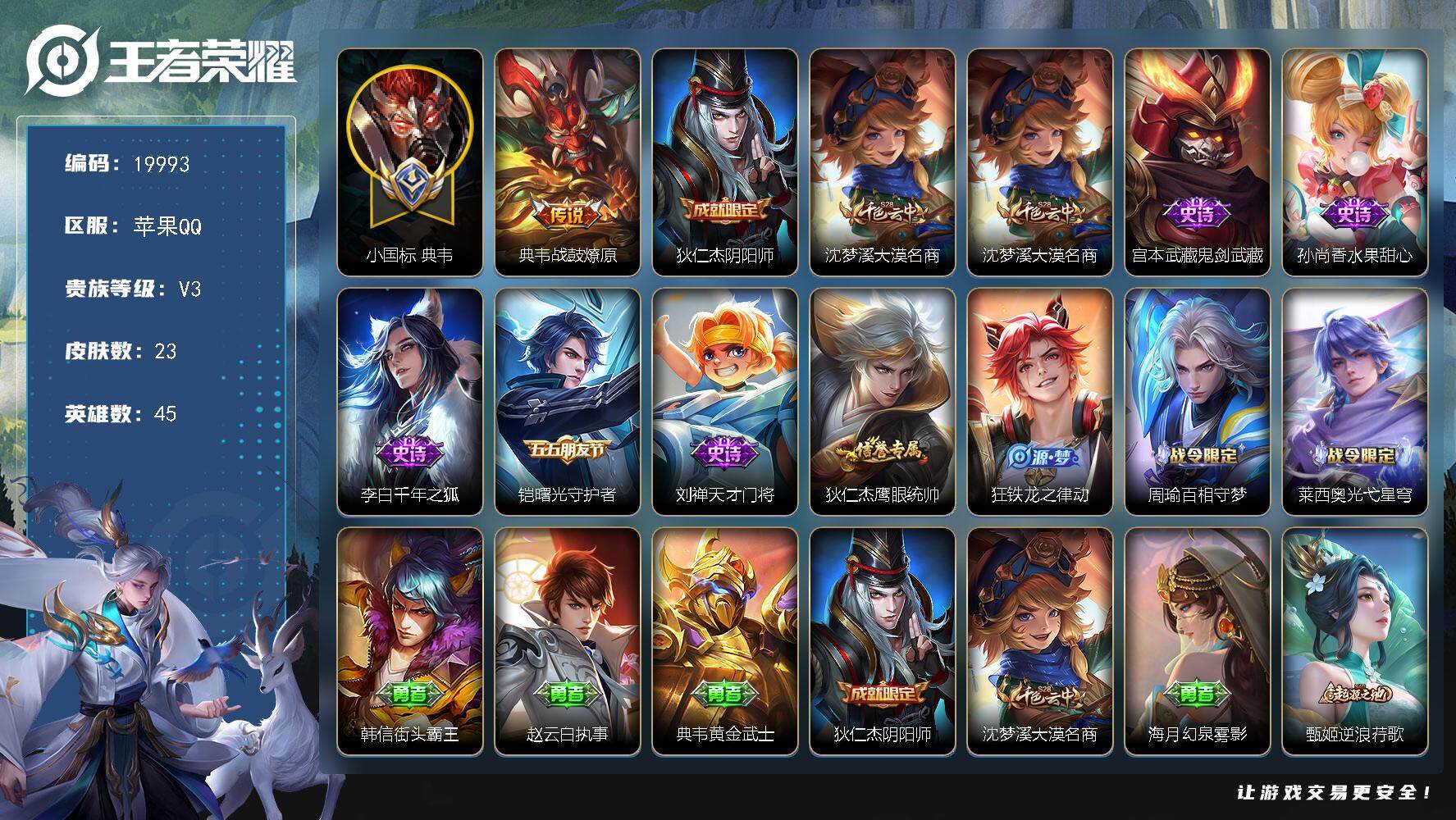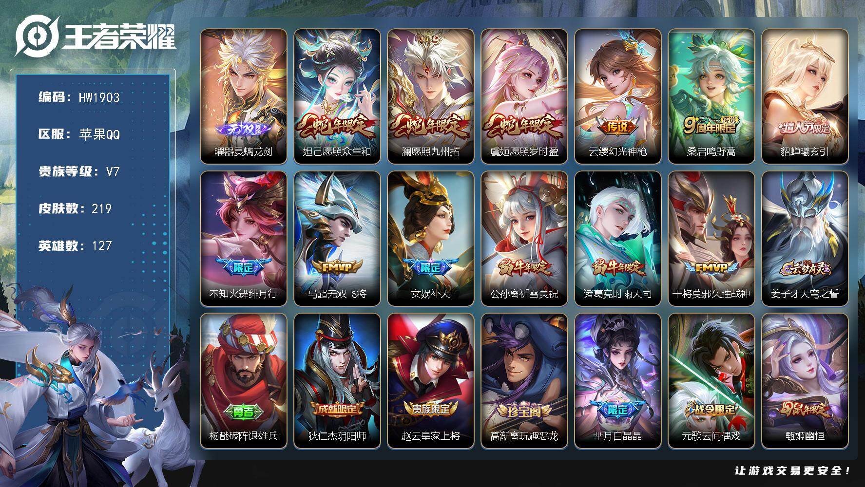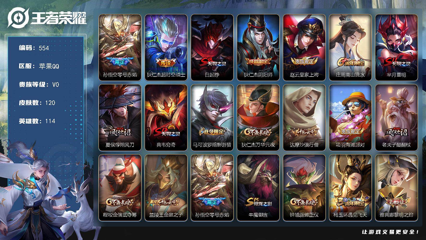 苹果Q-V0-尊贵铂金III段位-114英雄-120皮肤-2传说-22史诗【