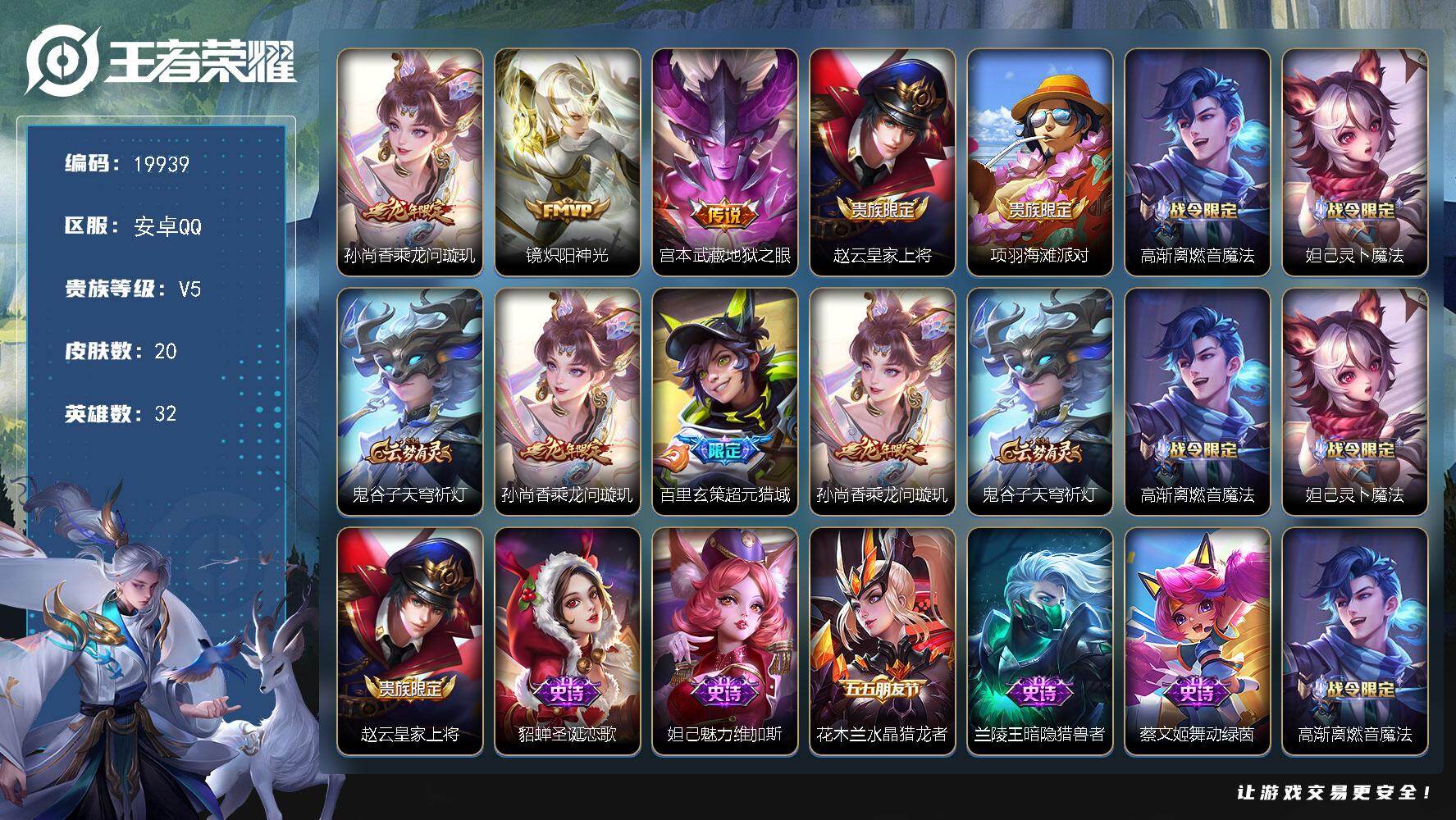 可换绑【性价比优质打野战士号 花木兰典藏 李白无双 龙年孙策 马超琥珀纪元 浮