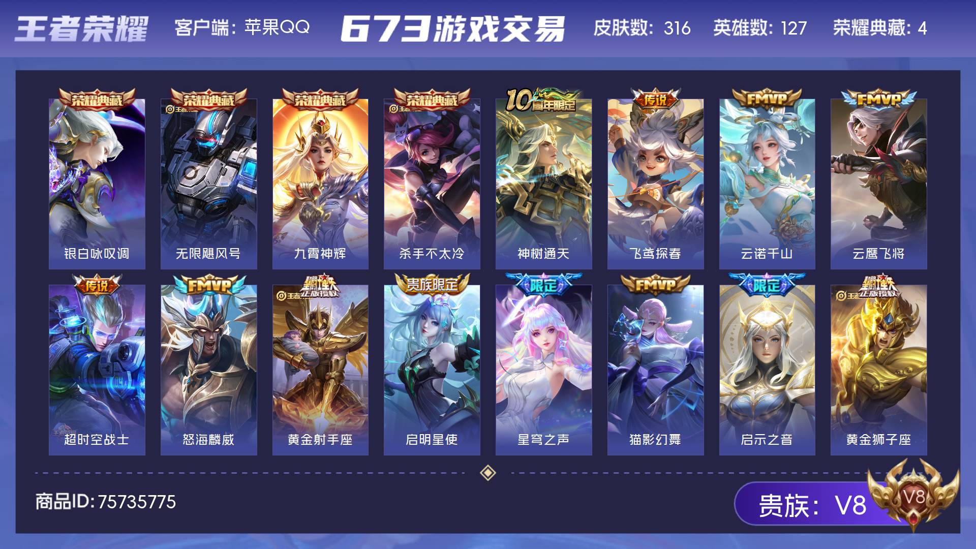 V8 皮肤316 英雄127 最强王者 荣耀典藏4 传说16 其他皮肤299