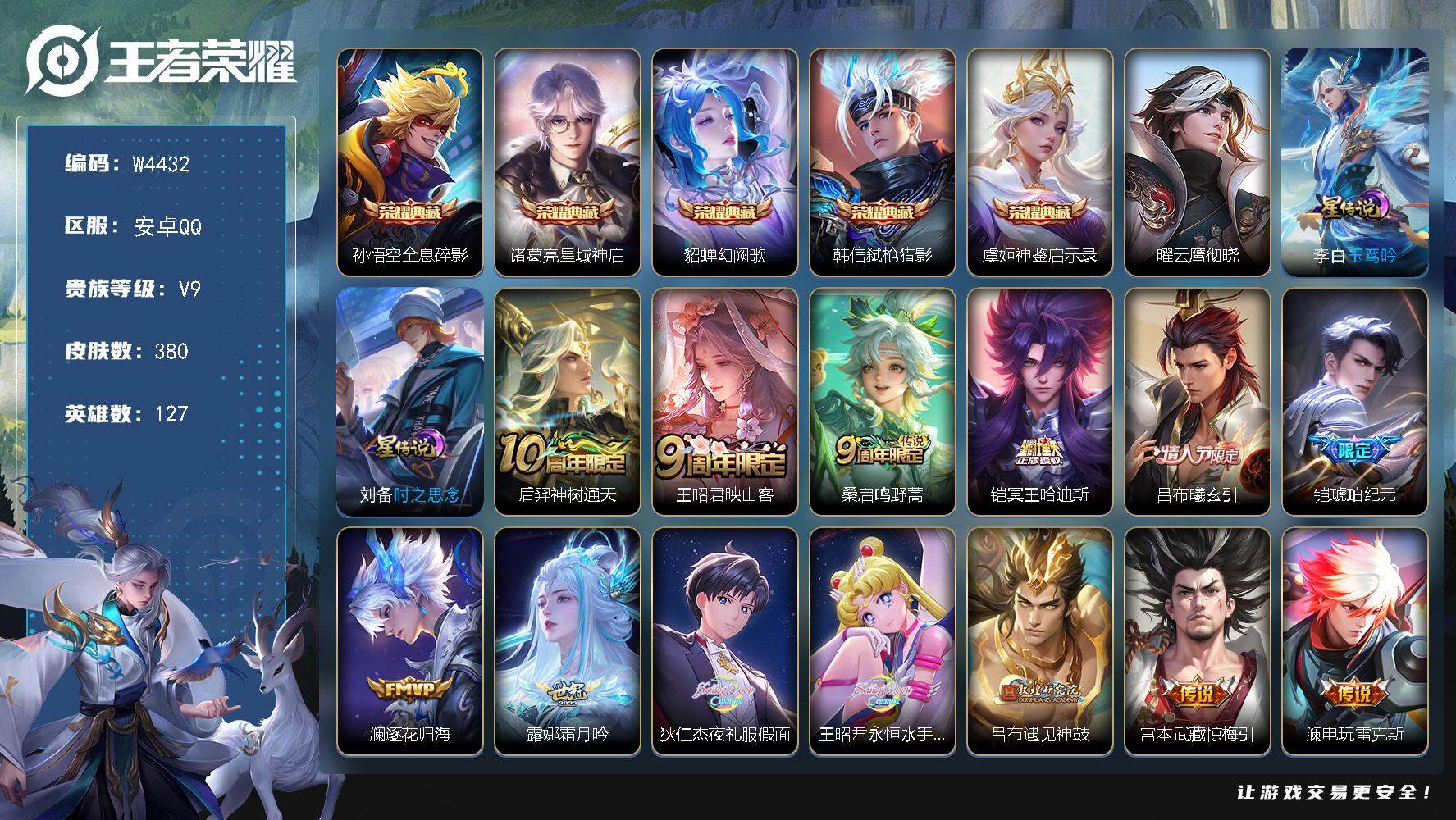 【W4432】安卓QQ-有二次-贵9-127英雄-380皮肤-5典藏-30传说