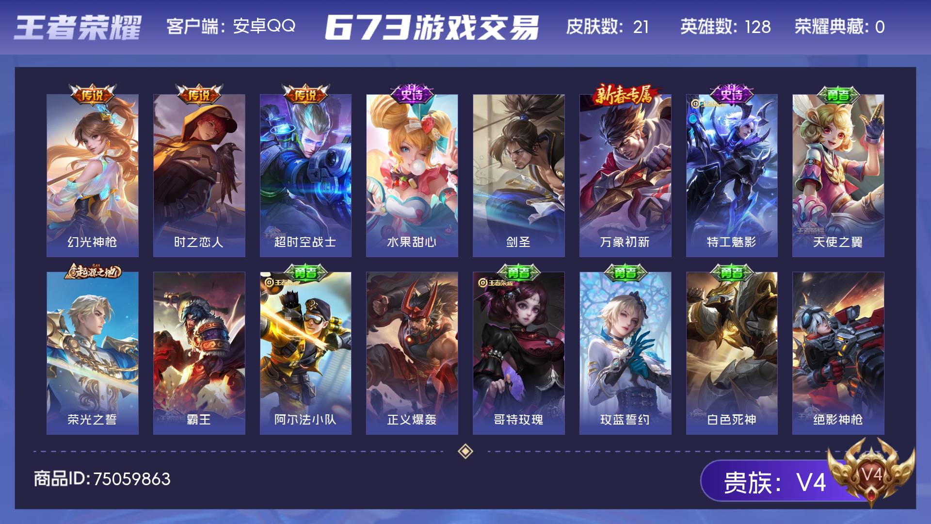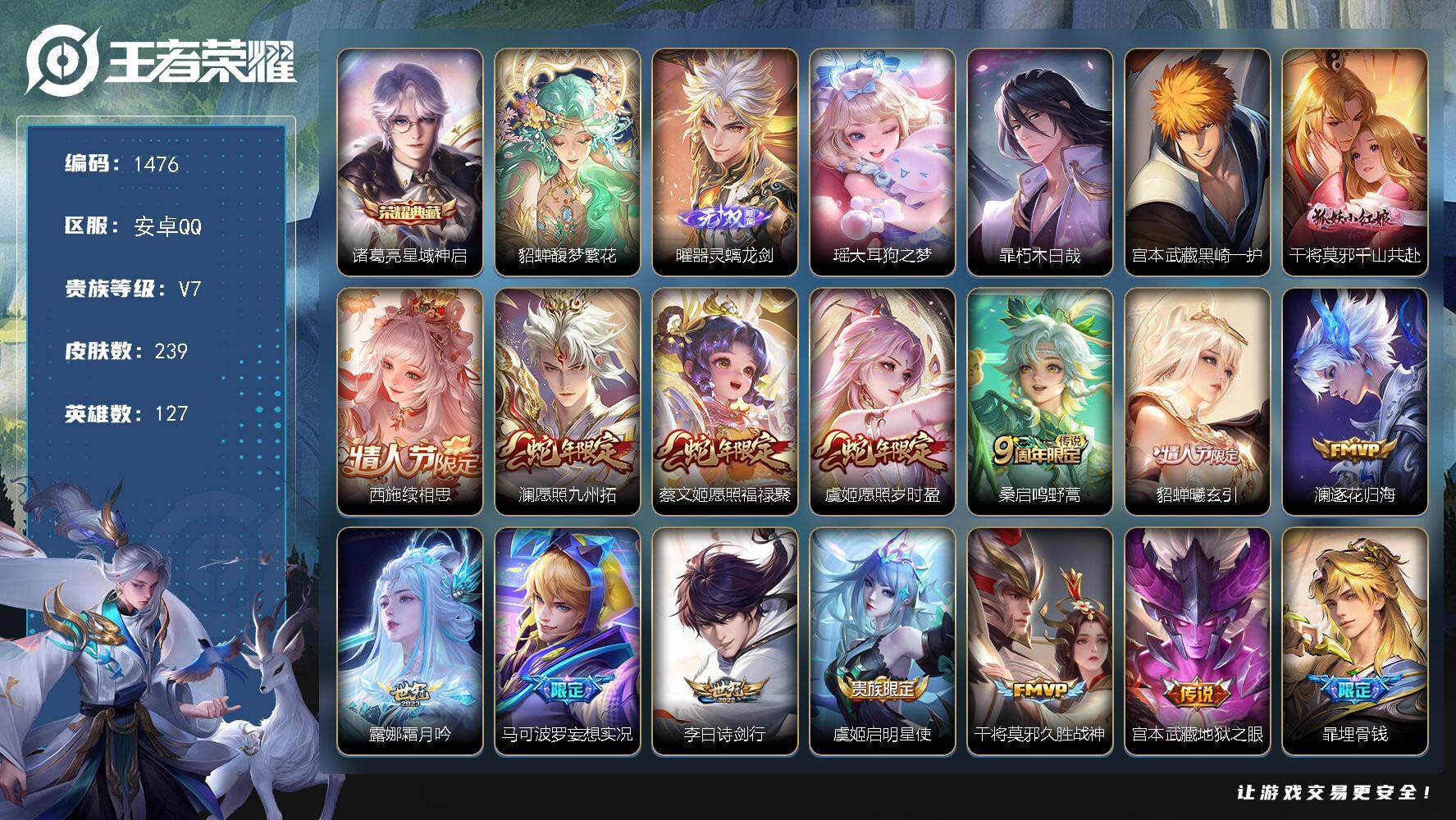 安卓QQ/至尊星耀/291皮肤/126英雄/1典藏/0珍品无双/2无双/3珍品传说/16传说/74史