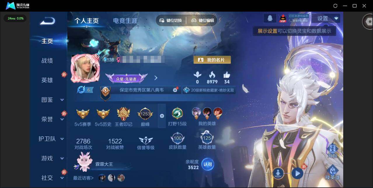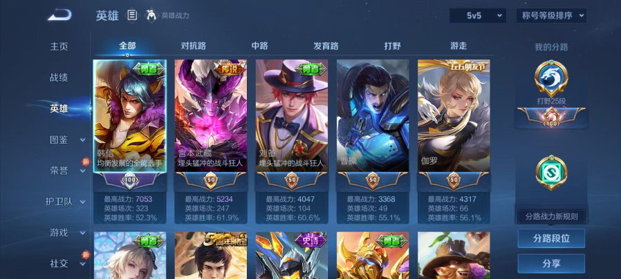 贵族等级: V6 英雄数: 125 皮肤数: 100 无双皮: 韩信群星魔术团