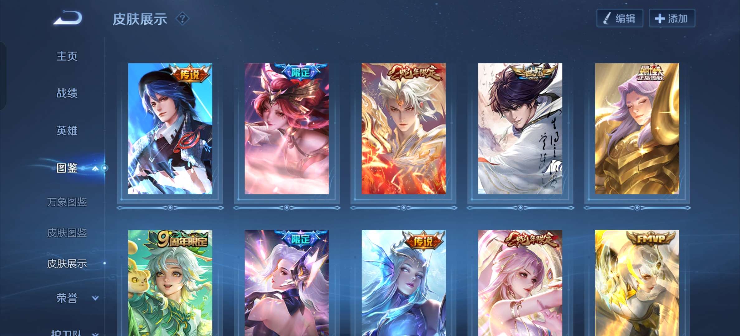皮肤507 英雄128 荣耀王者 荣耀典藏18 无双皮肤5 珍品传说4 传说95 其他皮肤179-贵族10 荣耀典藏19 无双5 珍品传说3 传说皮肤95 史诗皮肤159 皮肤数量505