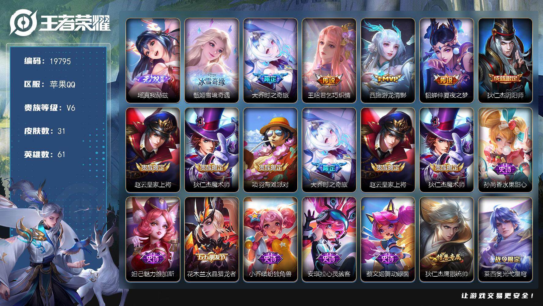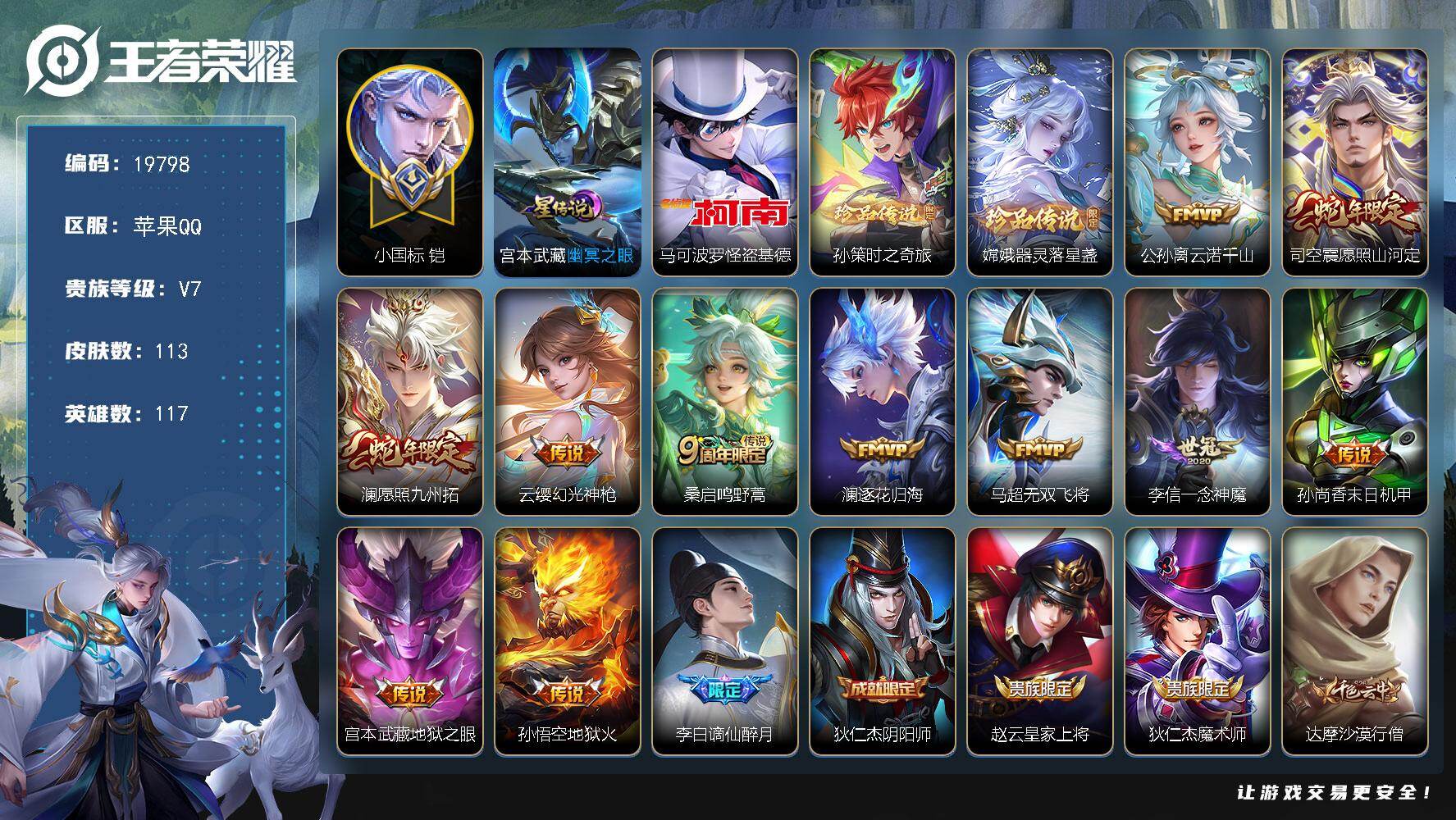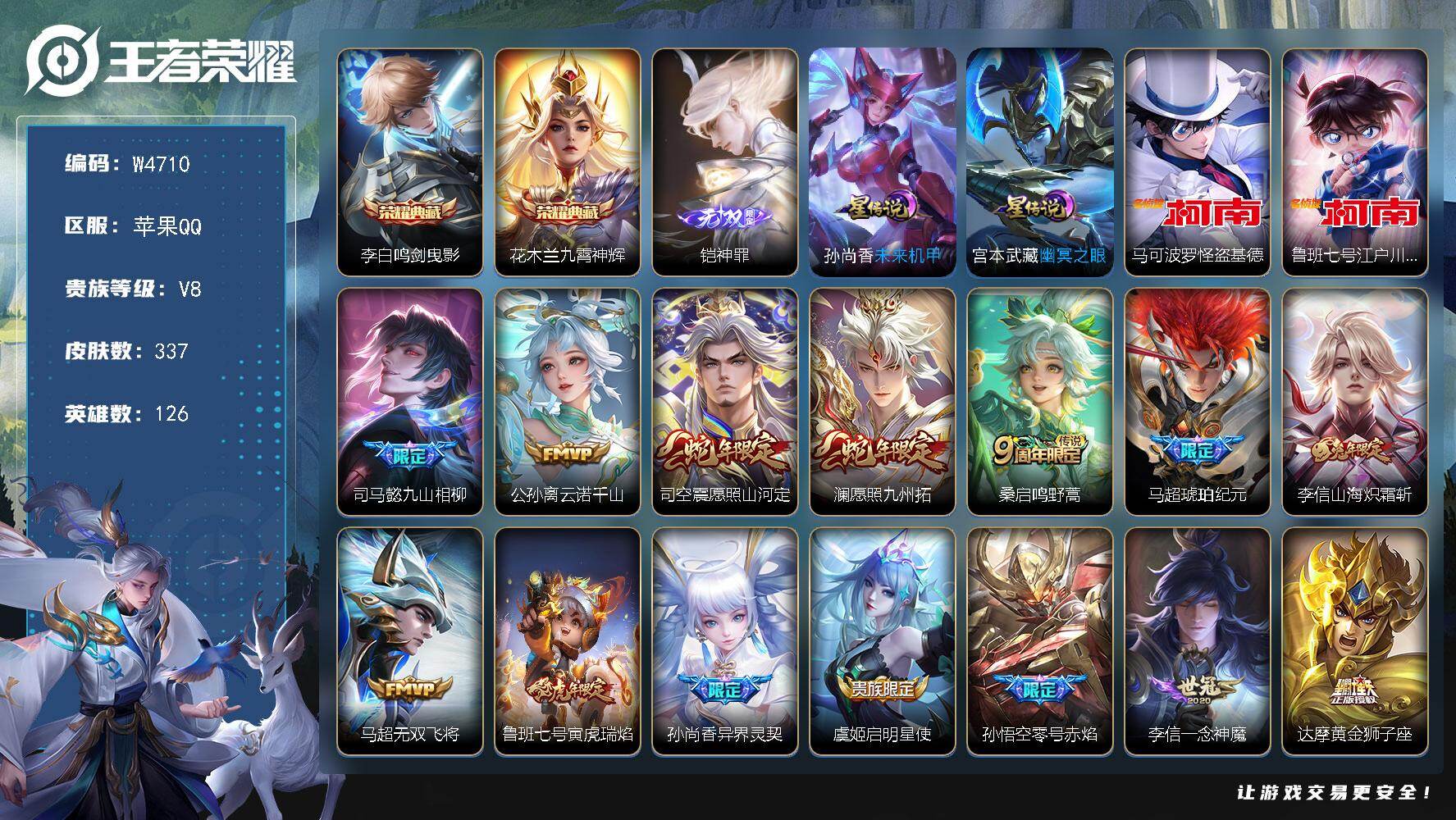 【W4710】苹果Q区-可二次-贵8-126英雄-337皮肤-2典藏-1无双-