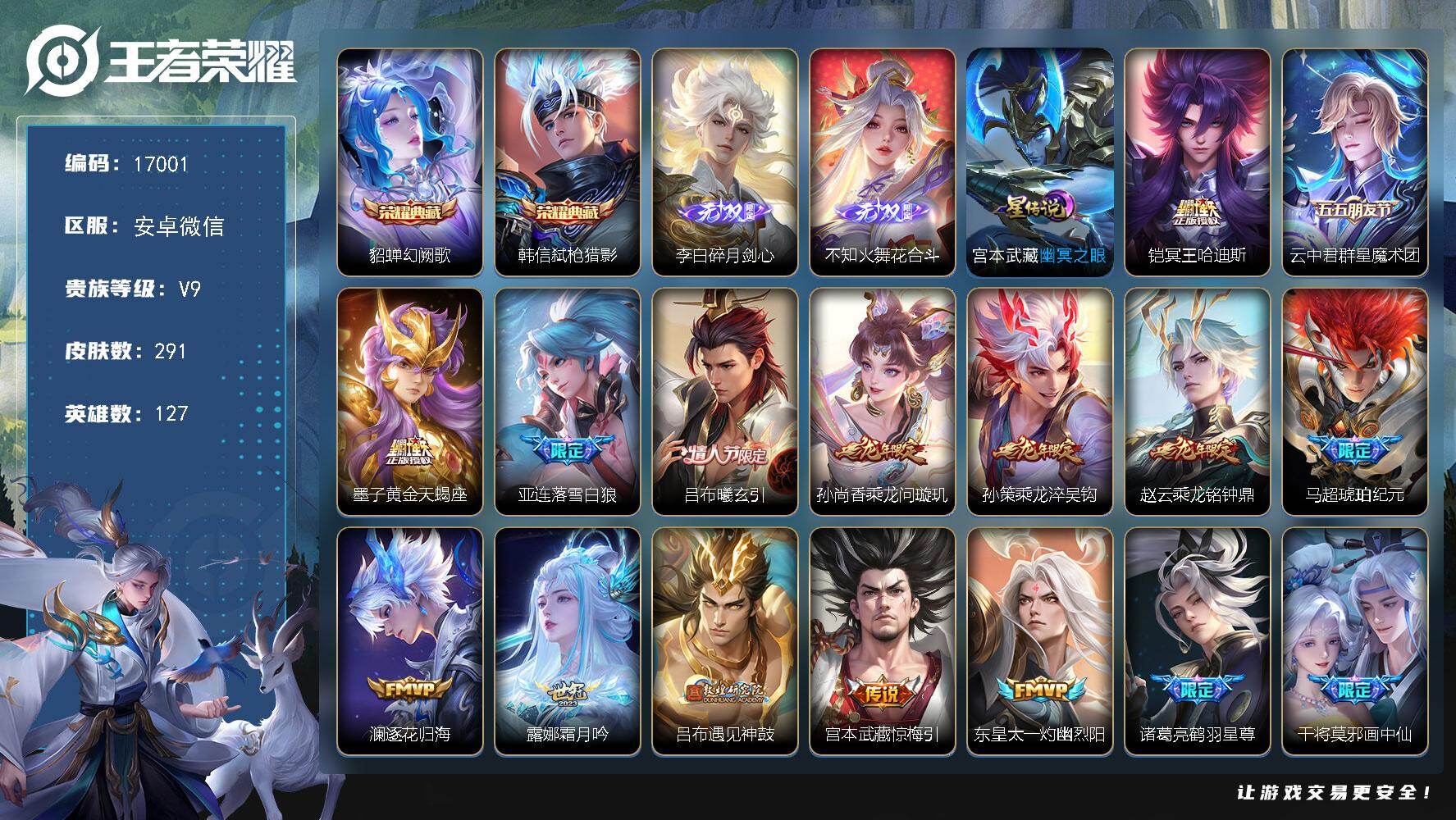 皮肤259 英雄126 荣耀王者 荣耀典藏1 传说7 其他皮肤105-弑枪猎影 凤求凰 李逍遥 永曜之星 武陵仙君 一念神魔 地狱之眼 至尊宝 梅西 霸王别姬女 蓝屏警告