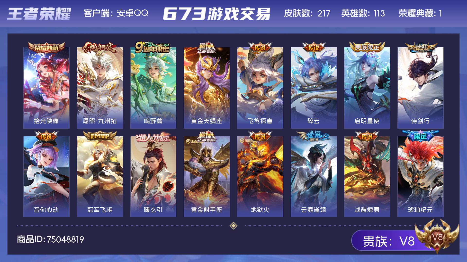 皮肤217 英雄113 永恒钻石 荣耀典藏1 传说28 其他皮肤195-【217皮1典藏27传说 拾光映像 愿照九州拓 黄金天蝎座 落雪白狼 琥珀纪元